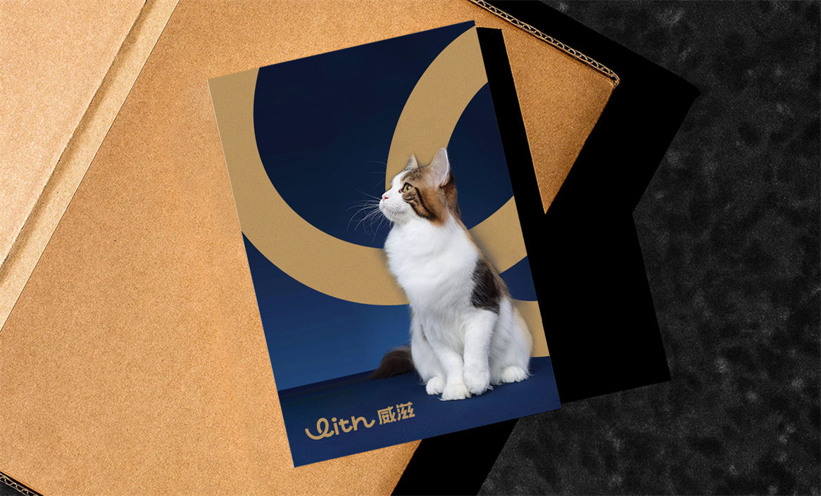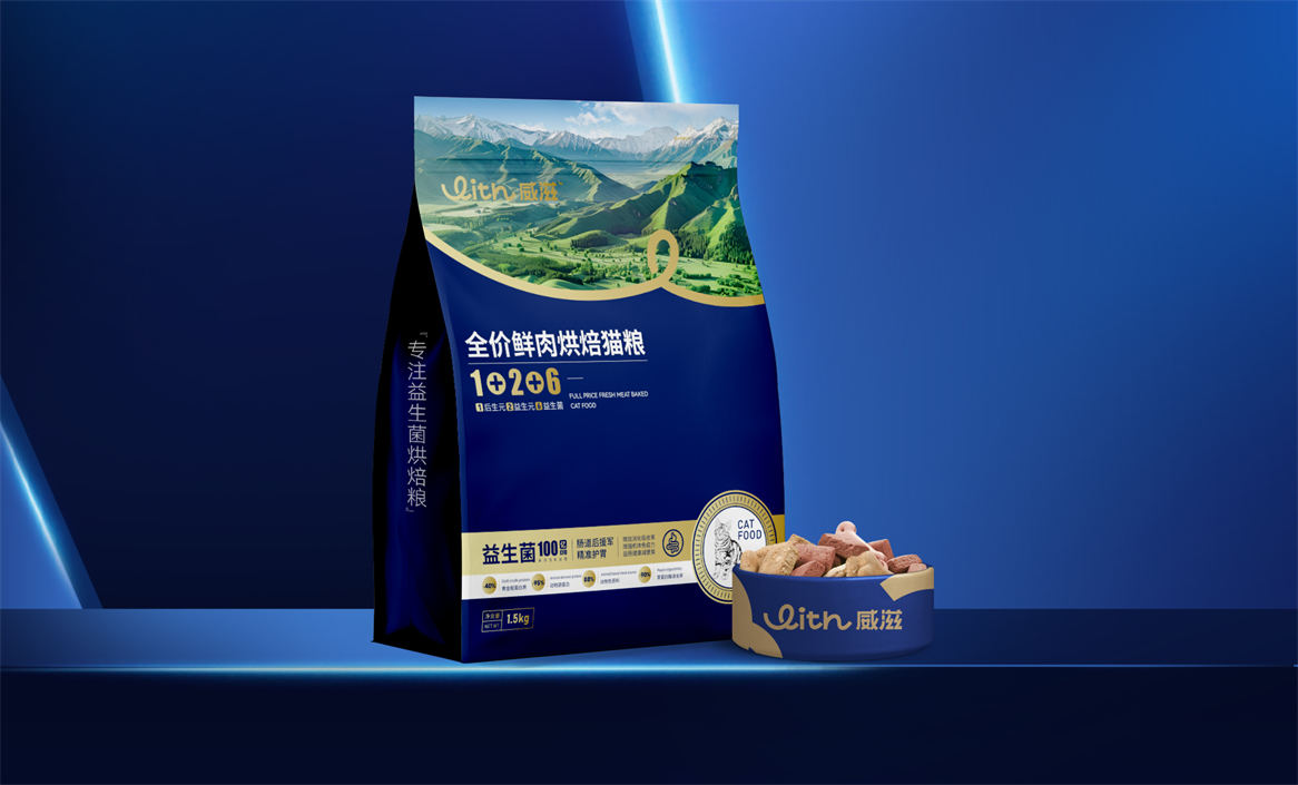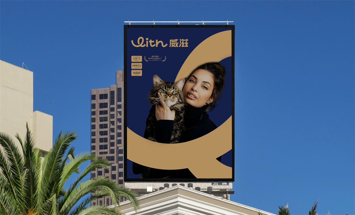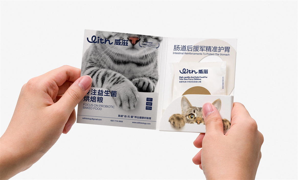 对于威滋品牌,我们确定好品牌策略后,就是解决品牌视觉识别问题,即品牌如何符号化,既能容易识别记忆,又能传递品牌核心理念。威滋品牌定位是功能型全价鲜肉烘焙猫粮,主打一个滋养陪伴,所以勤略团队就围绕这个点打造品牌视觉符号,利用品牌英文WITH巧妙的设计了一个代表链接和陪伴的符号,即是代表品牌的首字母,又是品牌核心理念的传达。整体品牌logo中英文设计,简约时尚大方,突显中高端和国际化气质。