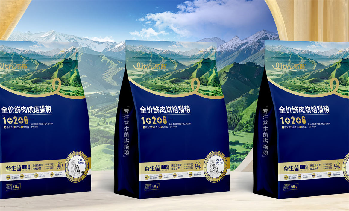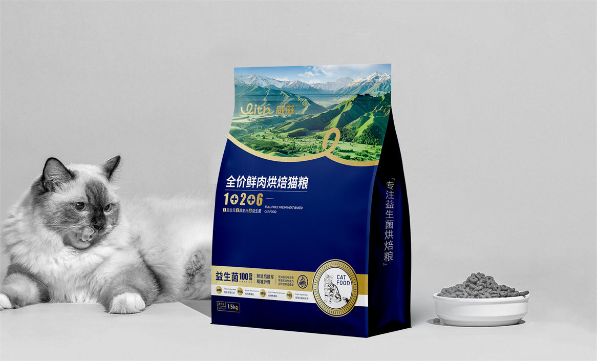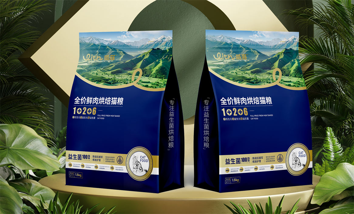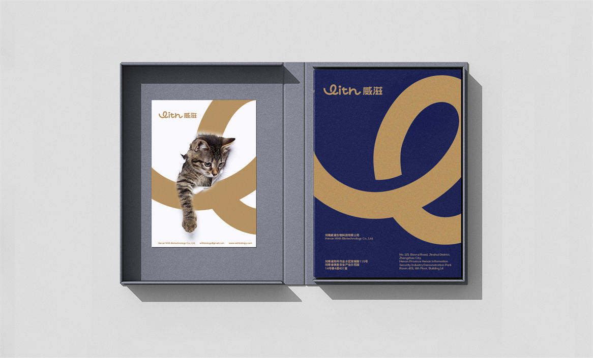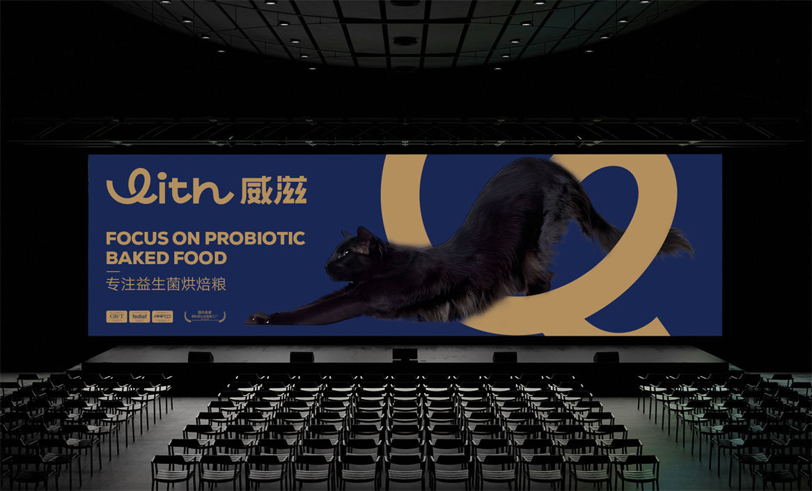 对于威滋品牌,我们确定好品牌策略后,就是解决品牌视觉识别问题,即品牌如何符号化,既能容易识别记忆,又能传递品牌核心理念。威滋品牌定位是功能型全价鲜肉烘焙猫粮,主打一个滋养陪伴,所以勤略团队就围绕这个点打造品牌视觉符号,利用品牌英文WITH巧妙的设计了一个代表链接和陪伴的符号,即是代表品牌的首字母,又是品牌核心理念的传达。整体品牌logo中英文设计,简约时尚大方,突显中高端和国际化气质。