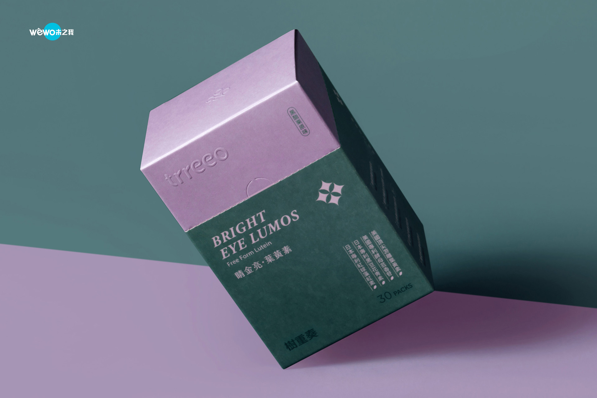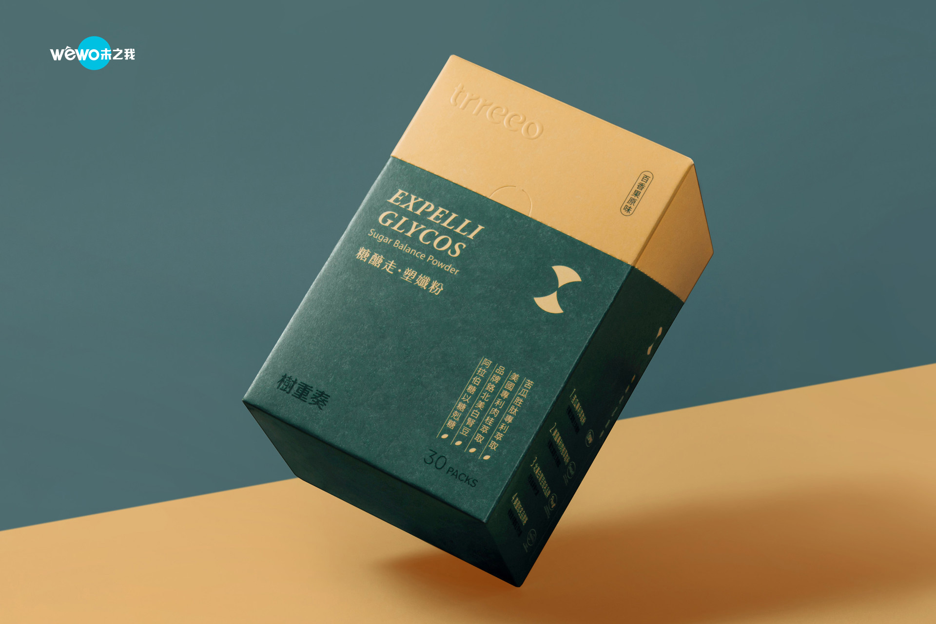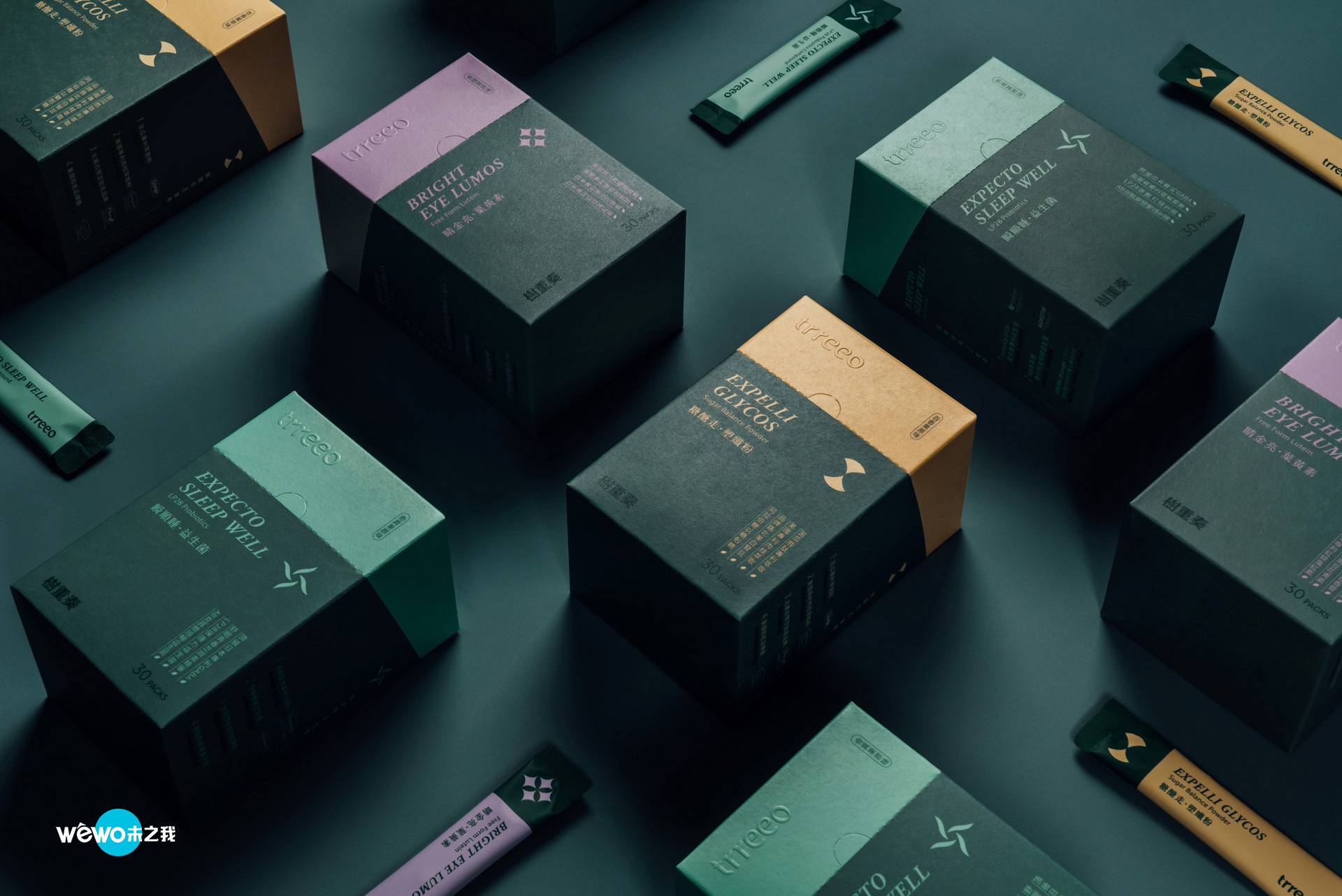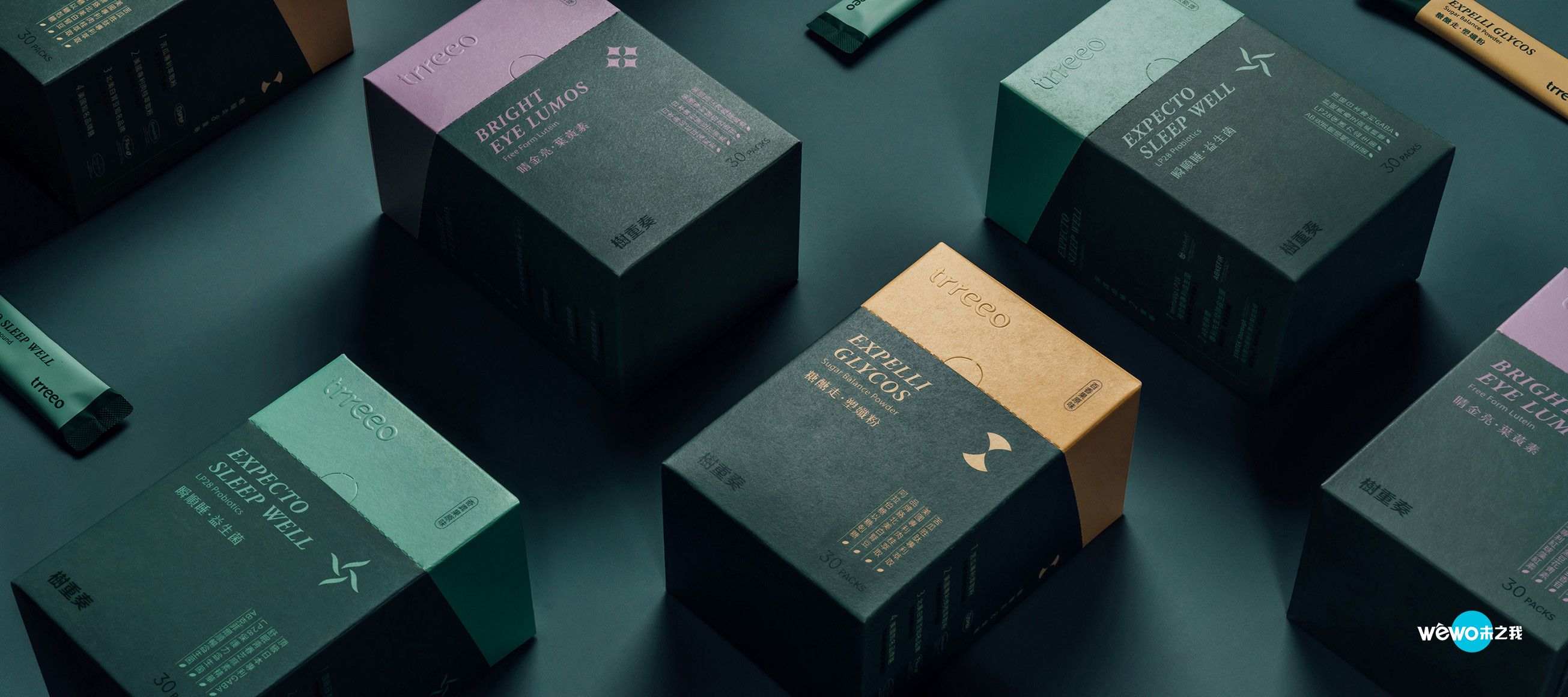 在包装设计版面的配置,跳脱以往以满版山果绿为底的设计,根据不同口味以相近颜色做出区别,并巧妙的将开盒虚线设定在颜色的分界处,不仅取用方便,区分更方便;并针对不同功能设计独特 Icon:糖糖走.塑纤粉以 Slim 为概念,加上沙漏的意象, 呈现出身体将会随着时间慢慢改变;睛金亮.叶黄素以星星的排列,呈现出视线明亮的感觉;瞬顺睡.益生菌则以转动的叶片传达出好菌带动身体的意象;简洁的版面编排,加上显而易见的成份萃取专利,让消费者放心且安心;后加工仅以识别打凸的方式简单呈现,整体盒形以朴实简约的风格打造,带出天然纯净植萃的感受。