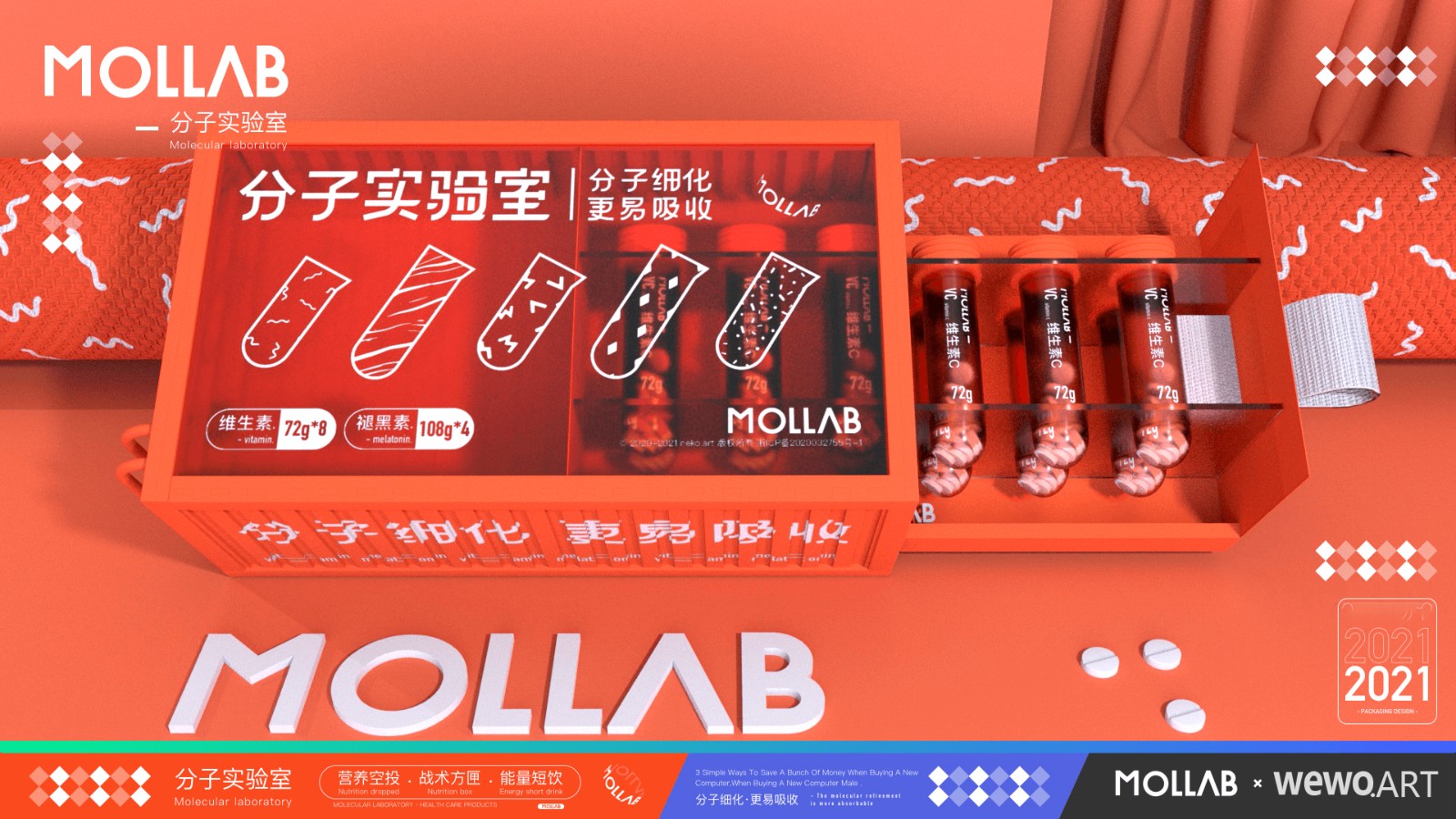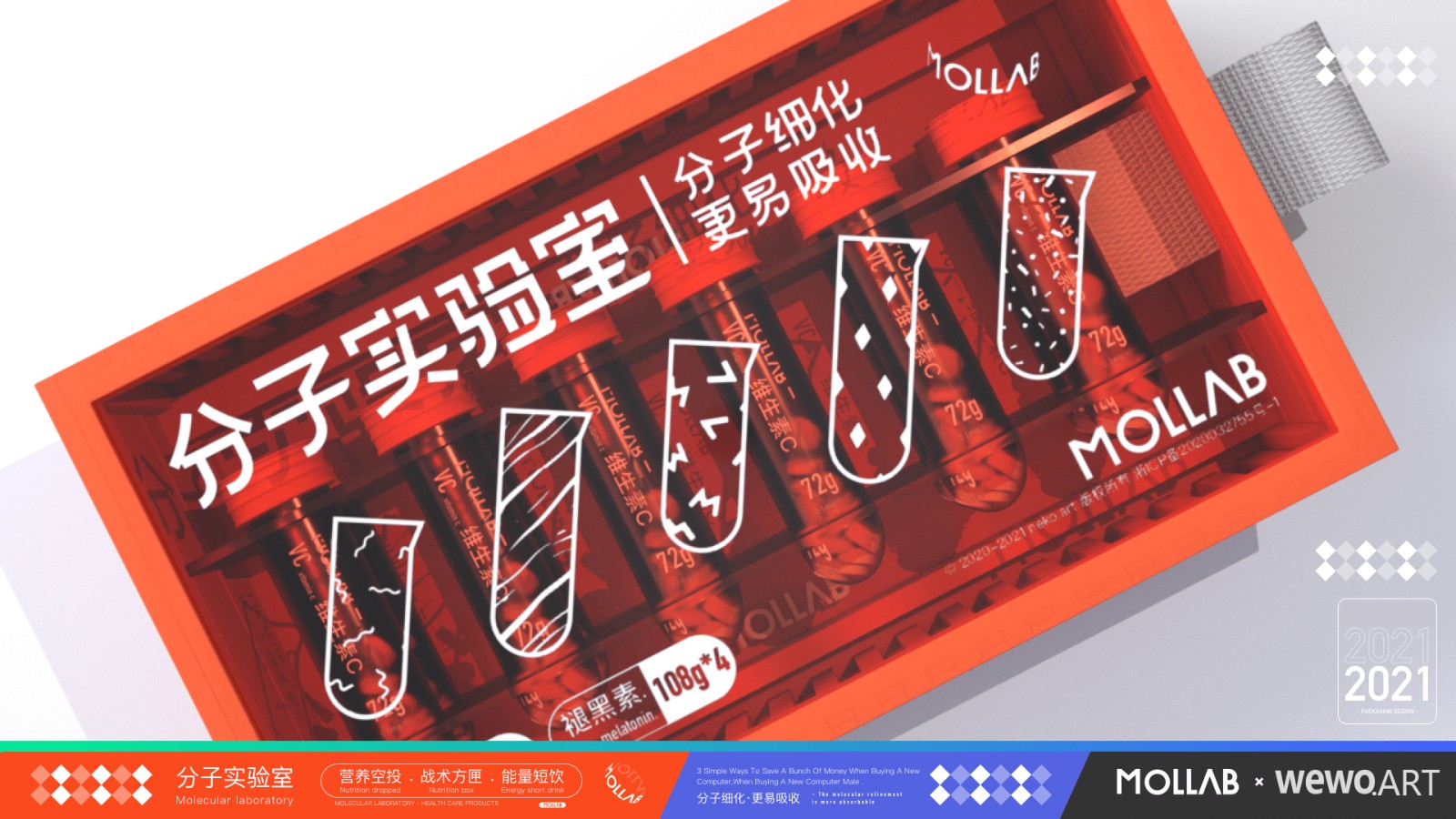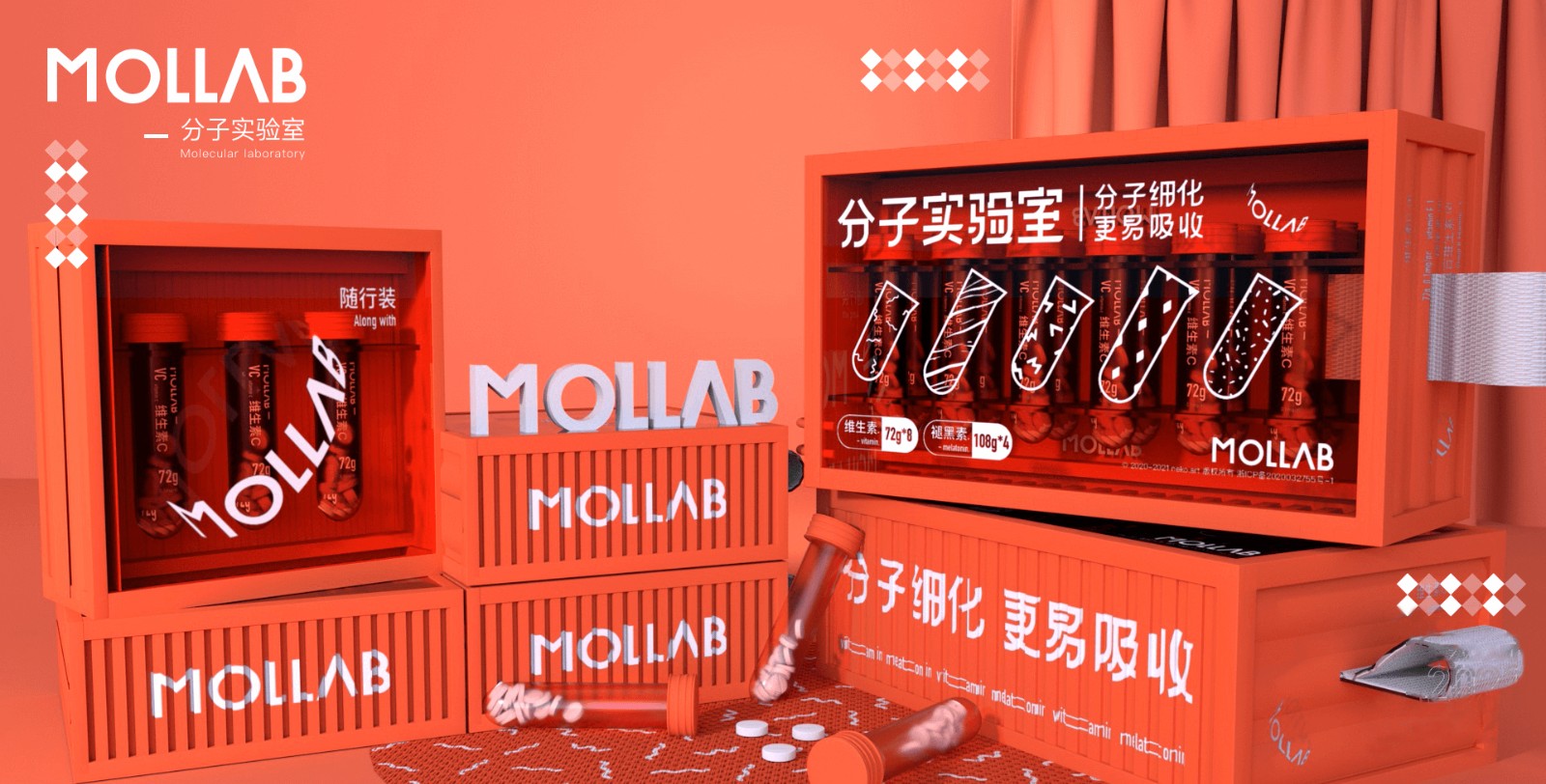 为区分市场,带来差异化。本设计运用了集装箱、试管等元素。大量透明亚克力材质的运用大大加强了包装的网感挺,同时给消费者带来了一定的信任度。而试管作为产品的最小单元,加大了辨识度的同时提高产品的便携性。同时本包装也是对保健品市场的一次年轻化探索。