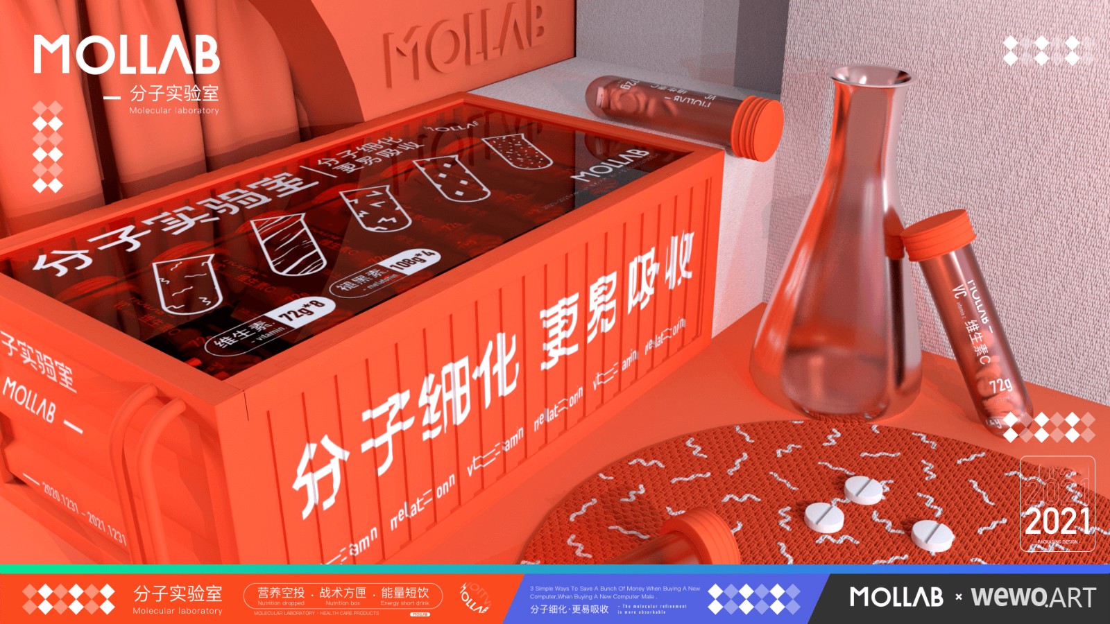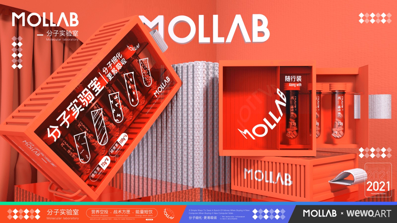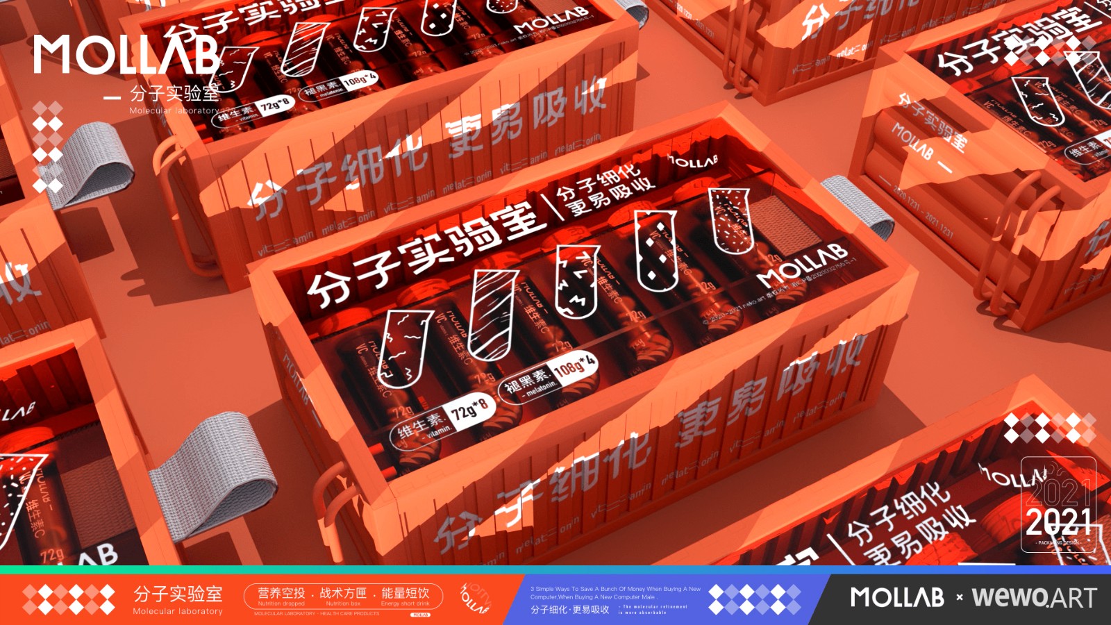 为区分市场,带来差异化。本设计运用了集装箱、试管等元素。大量透明亚克力材质的运用大大加强了包装的网感挺,同时给消费者带来了一定的信任度。而试管作为产品的最小单元,加大了辨识度的同时提高产品的便携性。同时本包装也是对保健品市场的一次年轻化探索。
