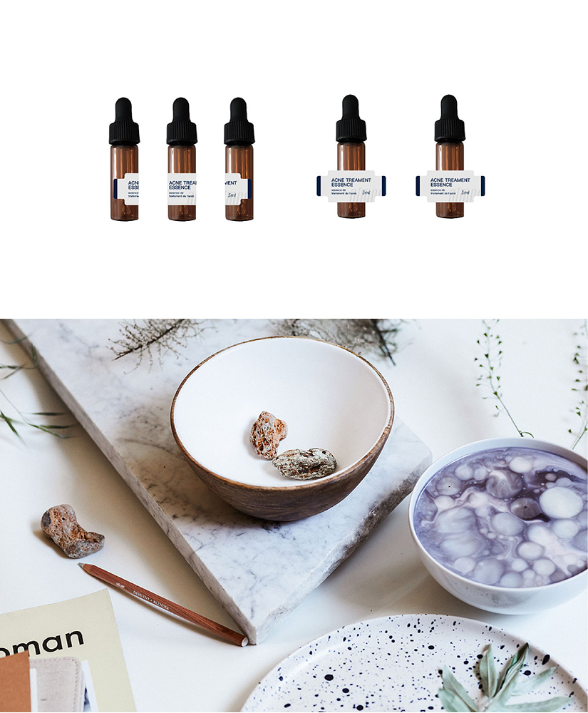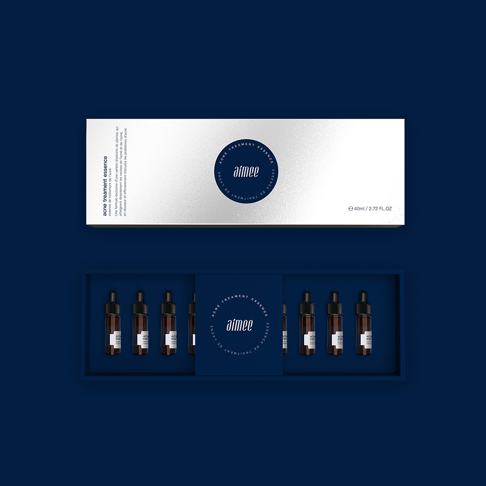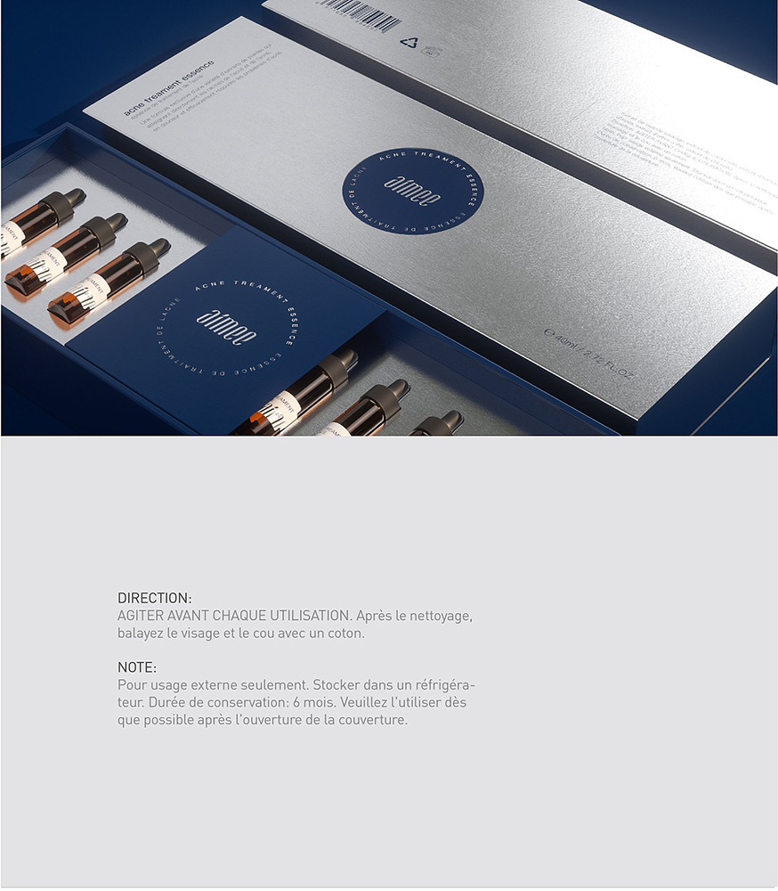 整体运用深蓝色和银色的双色设计,体现出祛痘秘方产品的专业感,独特、区别于市场的版式设计,让消费者耳目一新。