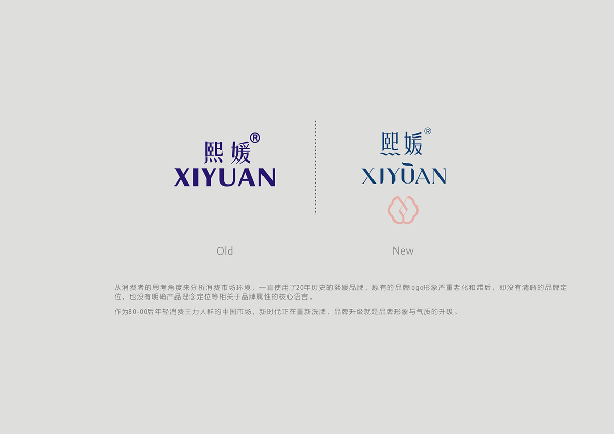 从消费者的思考角度来分析消费市场环境,一直使用了20年历史的熙媛品牌,原有的品牌logo形象严重老化和滞后,即没有清晰的品牌定位,也没有明确产品理念定位等相关于品牌属性的核心语言。