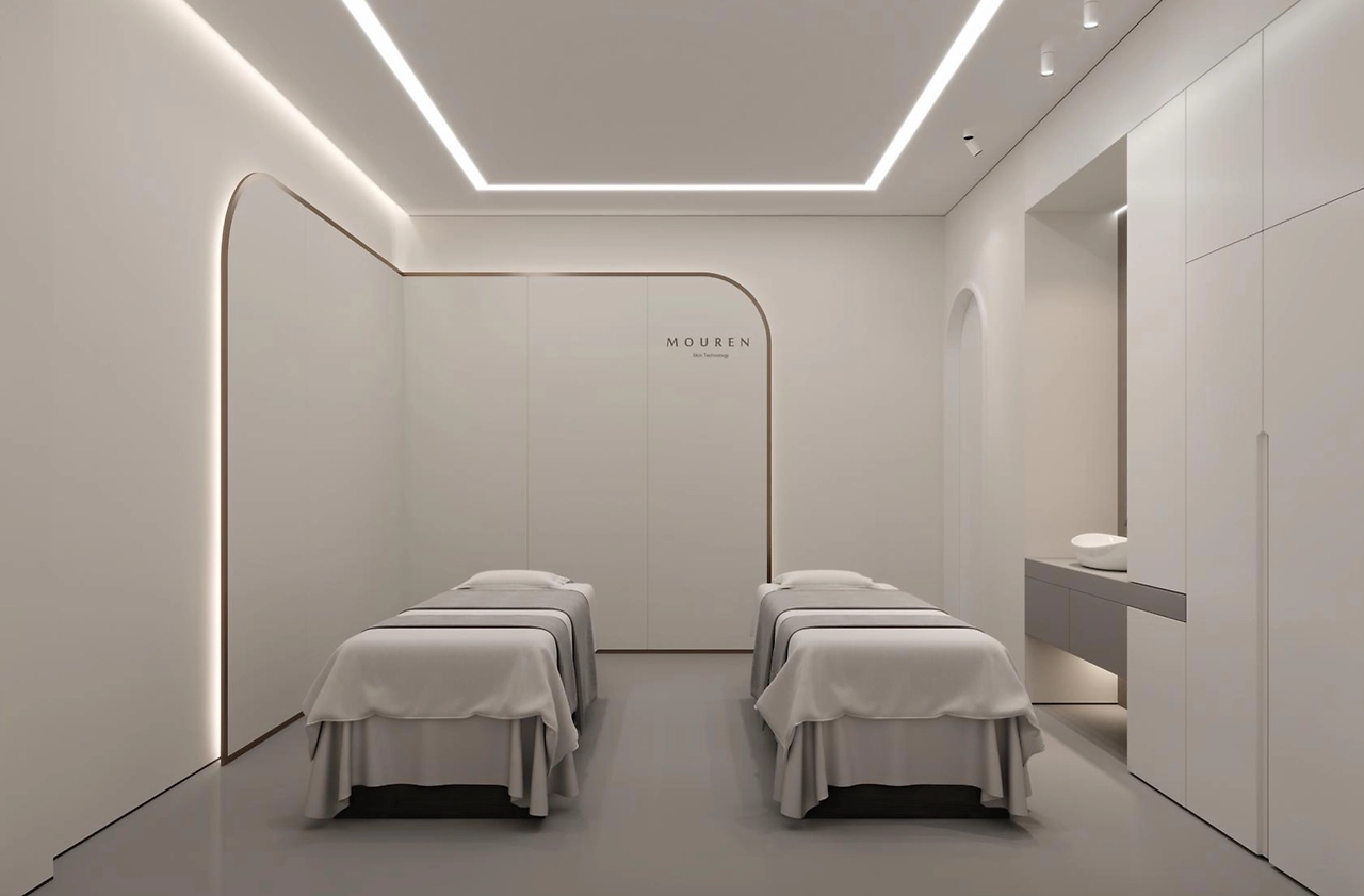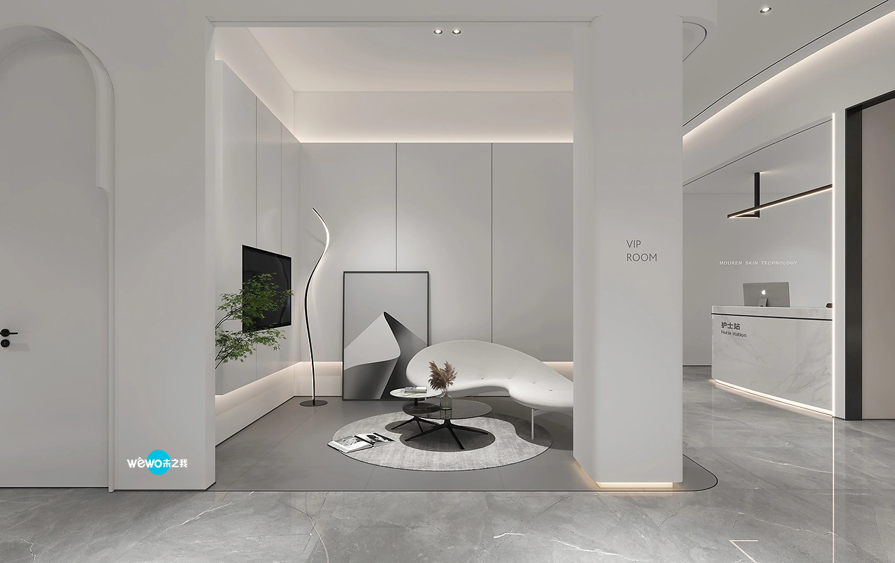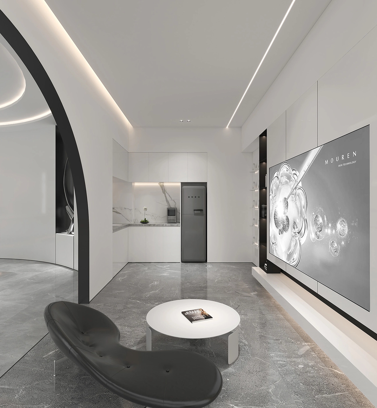 在材质的选择上,我们以白色烤漆、乳胶漆为主,为顾客营造了一个放松安心的空间,加上深灰色金属的点缀搭配,增加了空间的层次感,科技感,同时精致皮质家具的加入,不仅是让空间更具品质感,还体现了品牌的美感,让顾客对选择茉翎来变美更加有信心。