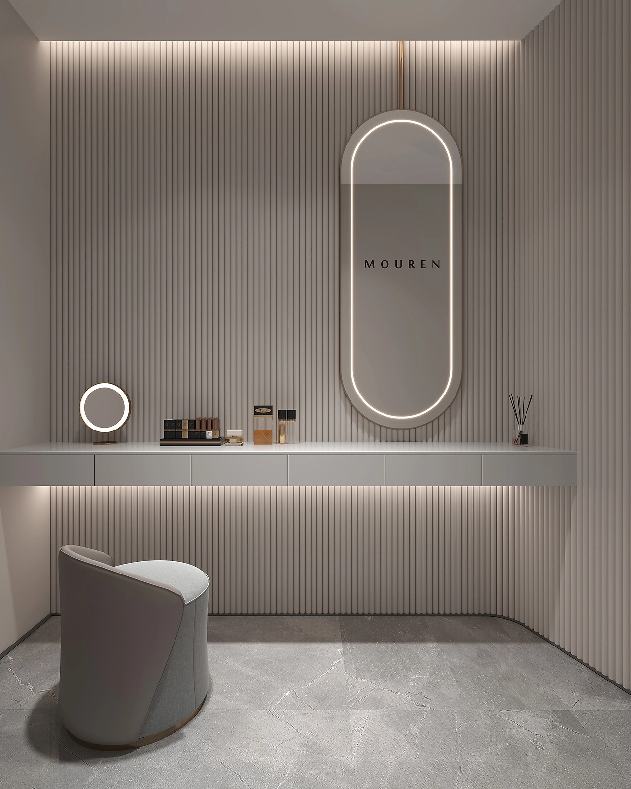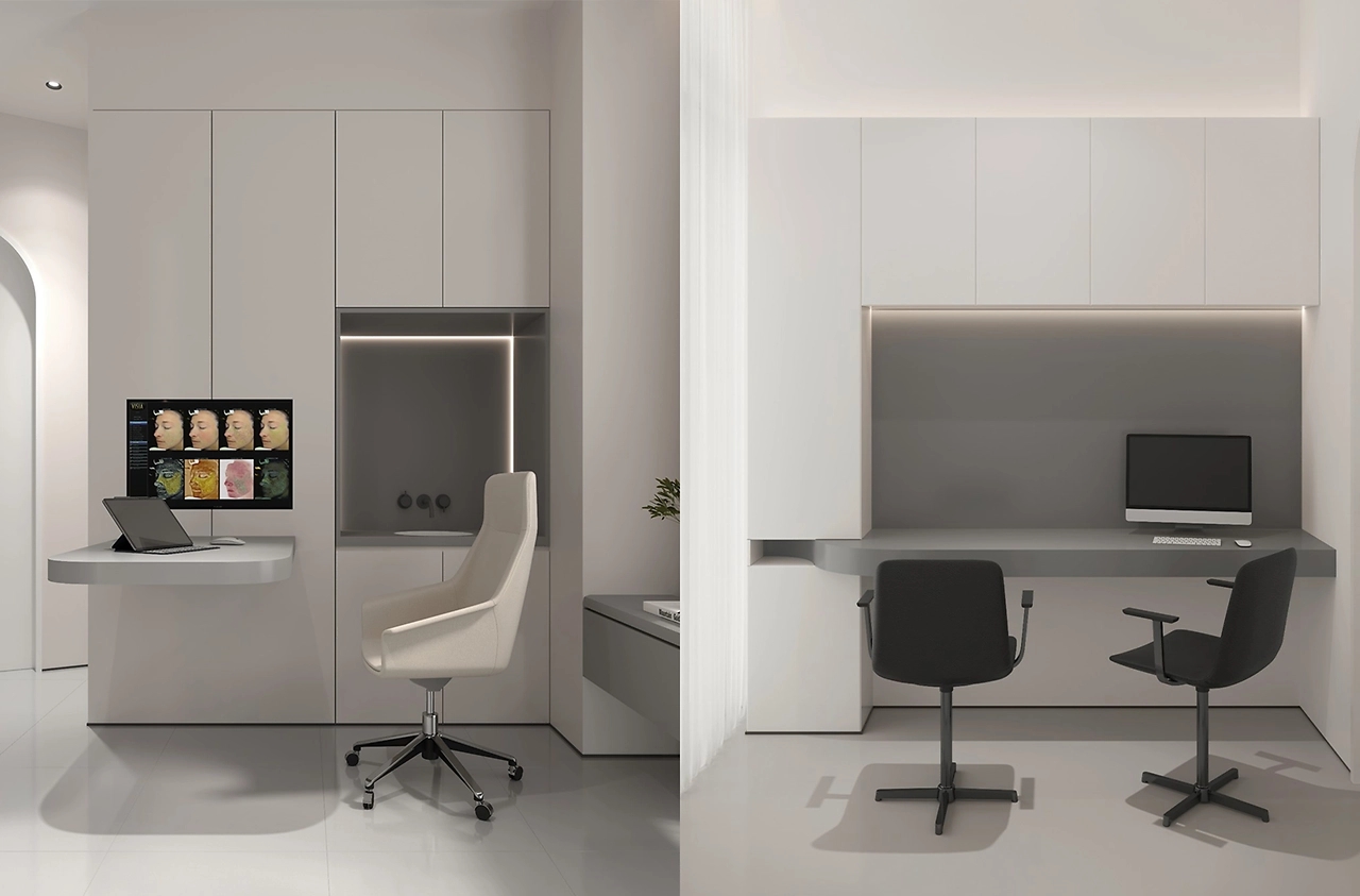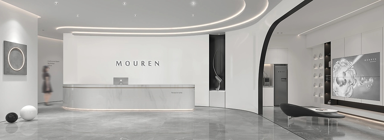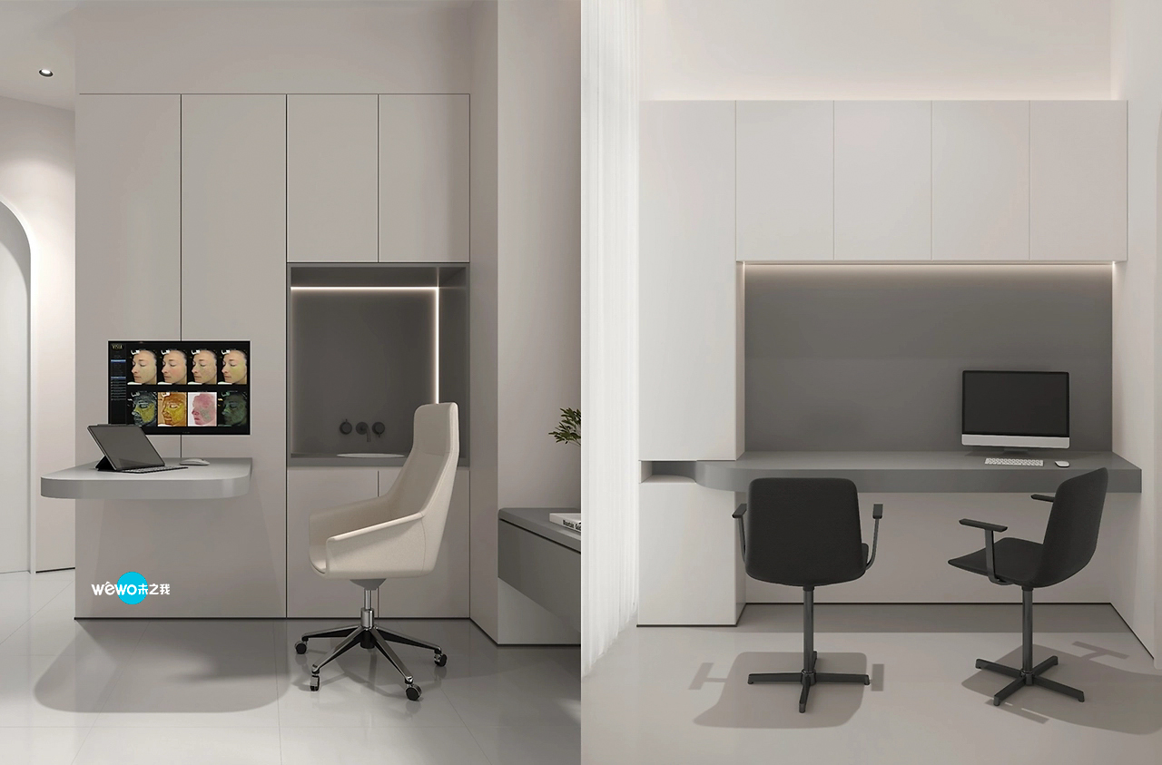 在材质的选择上,我们以白色烤漆、乳胶漆为主,为顾客营造了一个放松安心的空间,加上深灰色金属的点缀搭配,增加了空间的层次感,科技感,同时精致皮质家具的加入,不仅是让空间更具品质感,还体现了品牌的美感,让顾客对选择茉翎来变美更加有信心。