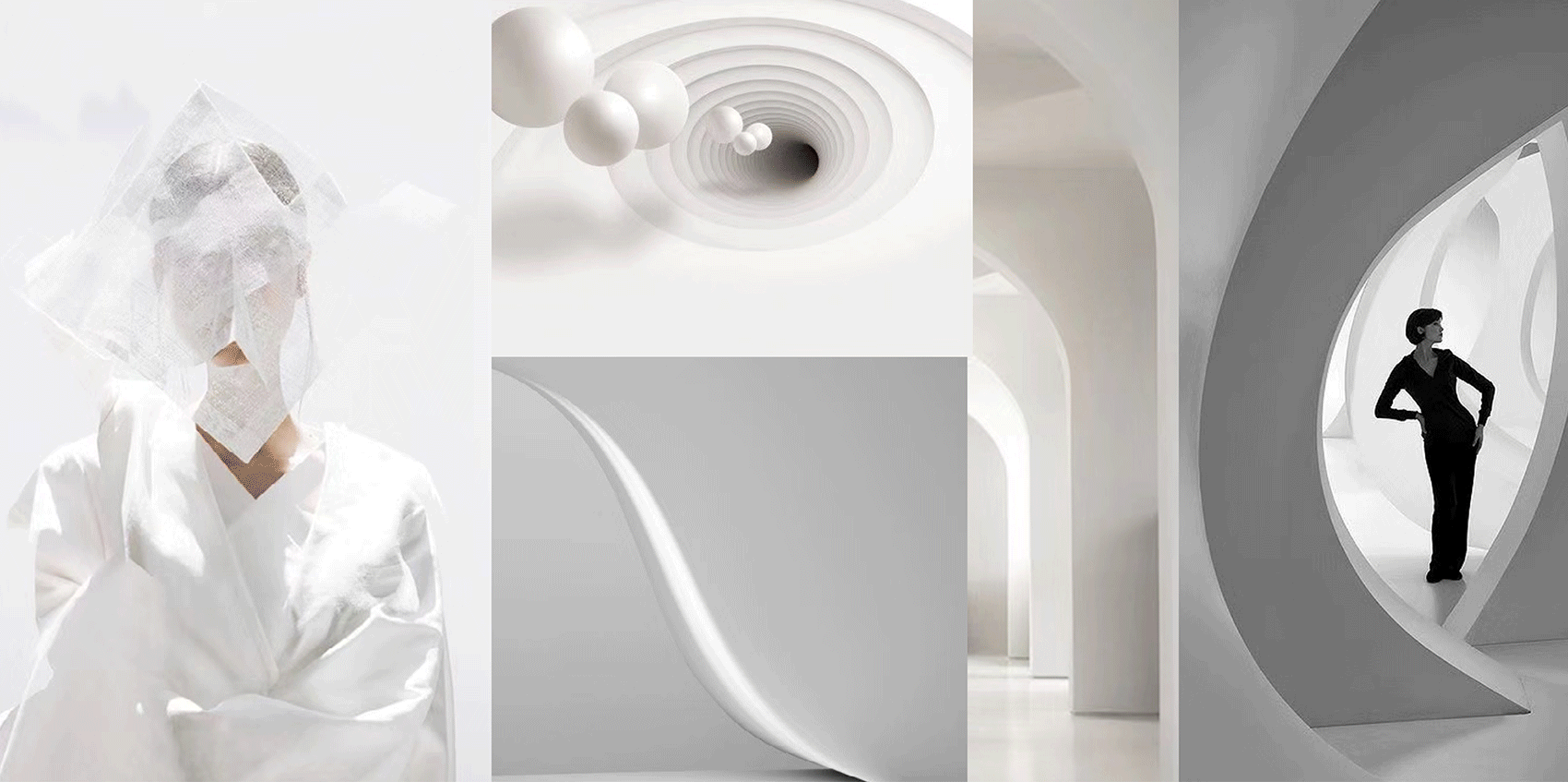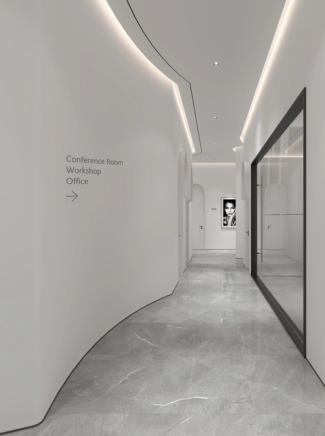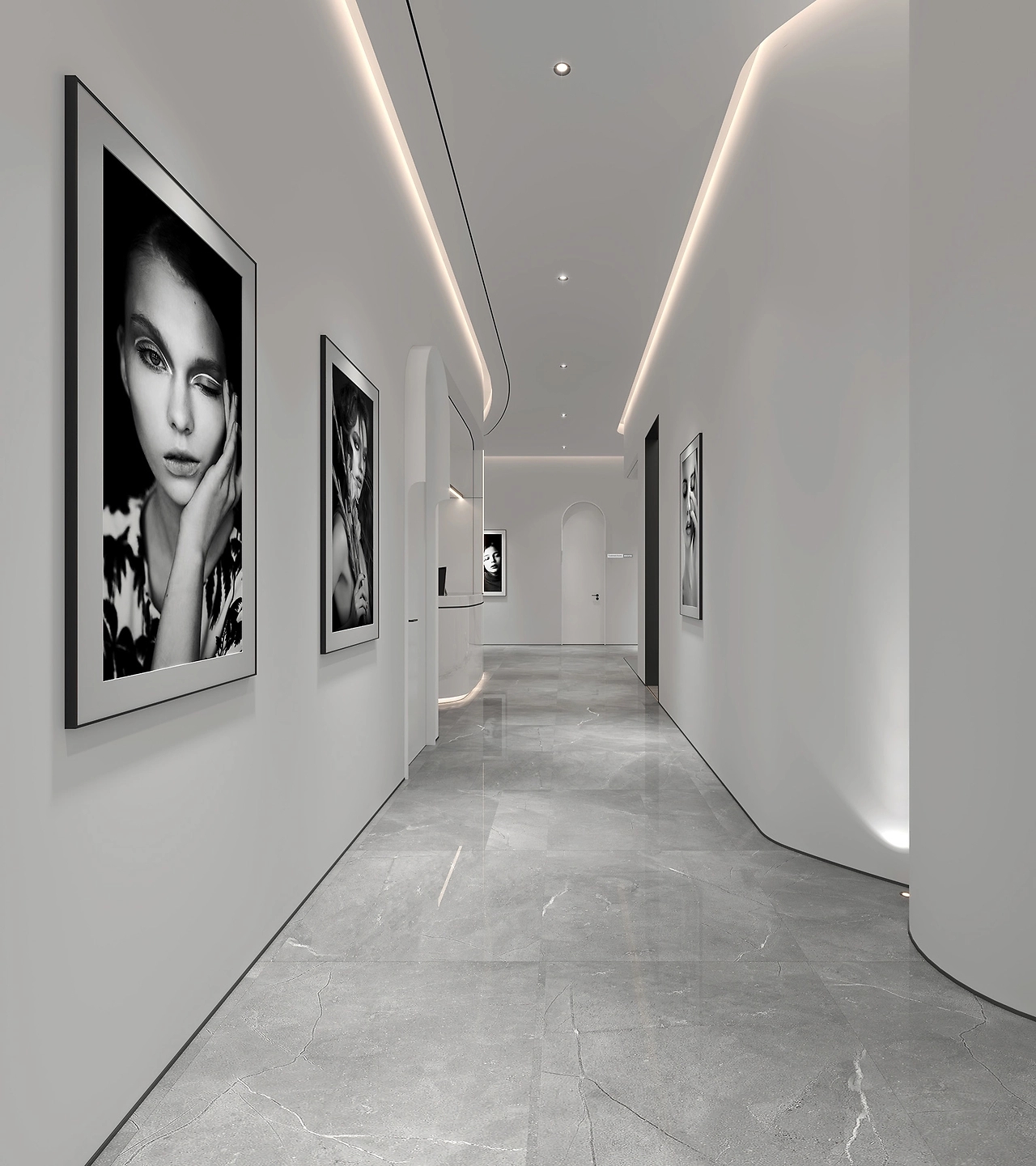 我们用弧形元素替代直角转角,营造了一种音乐的韵律感,也有一点点神秘色彩,这正是美丽女性带给人们的感觉,自信而又有魅力。顶部的光带顺着路径,让人宛如置身时光隧道,走向另一个时空迎接美丽自信的自己。同时我们以装饰性的导视标识代替冰冷的文字,塑造一个舒适柔和的空间氛围。