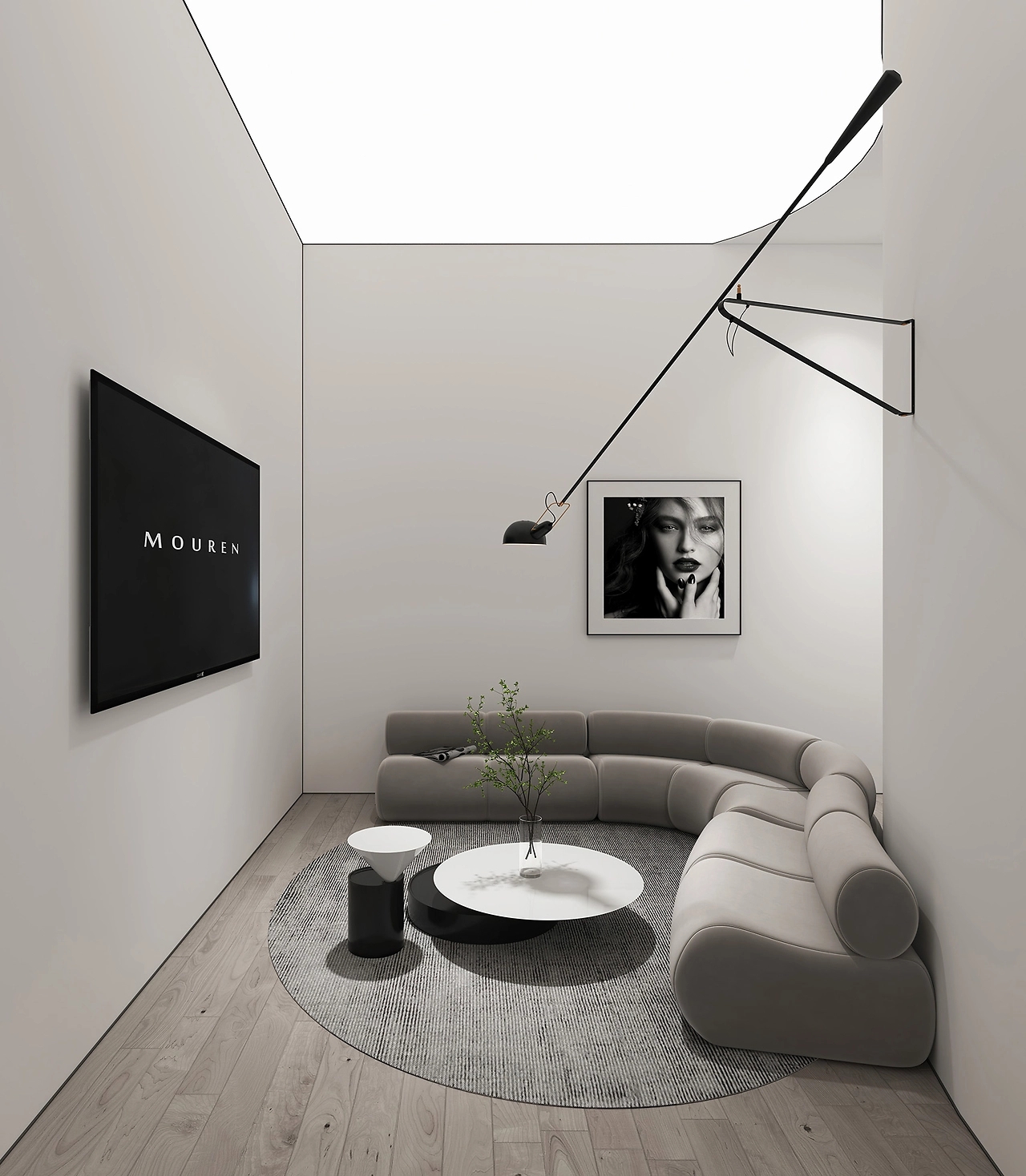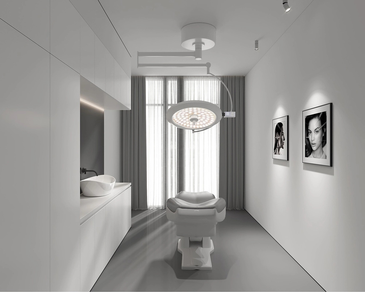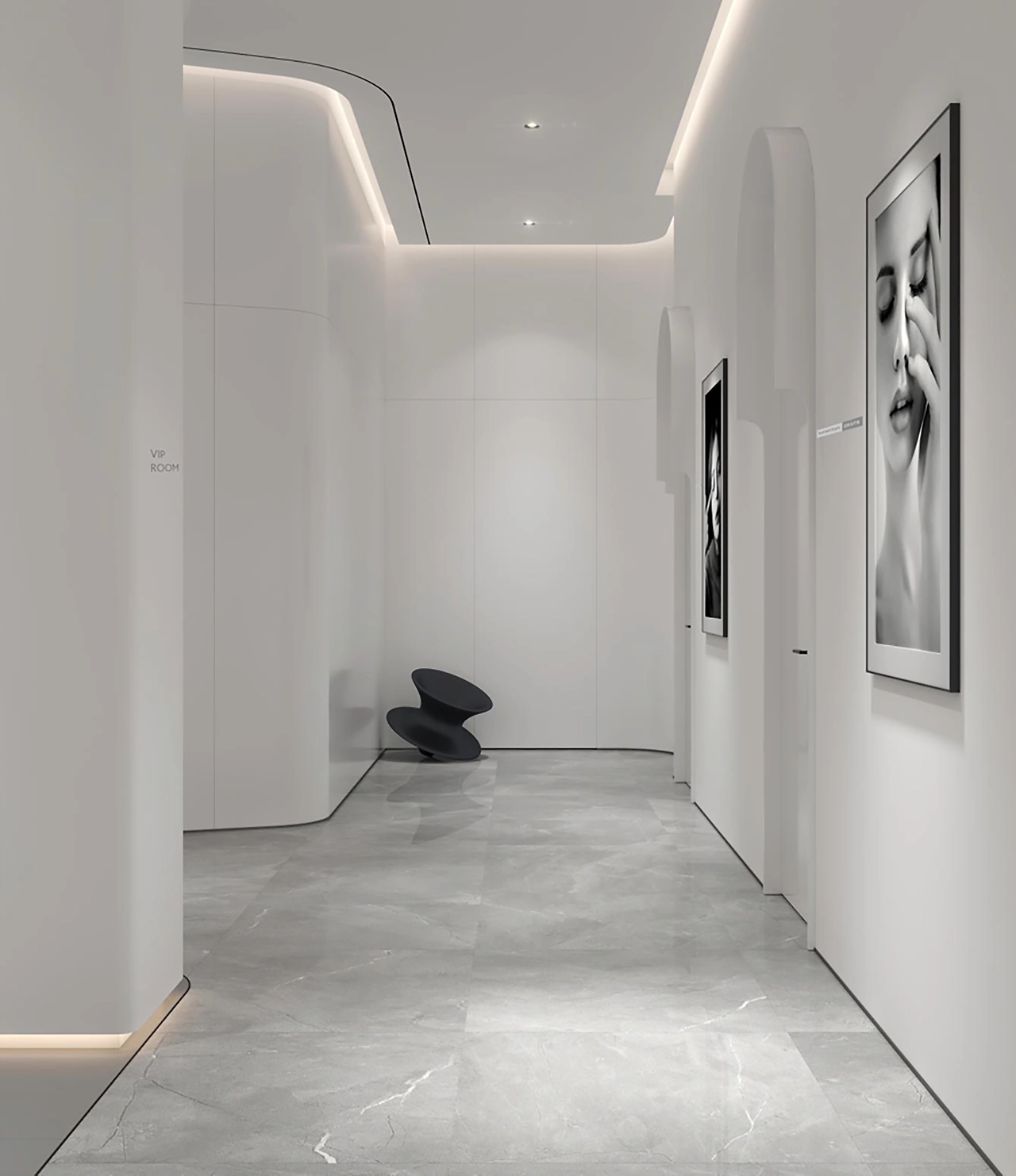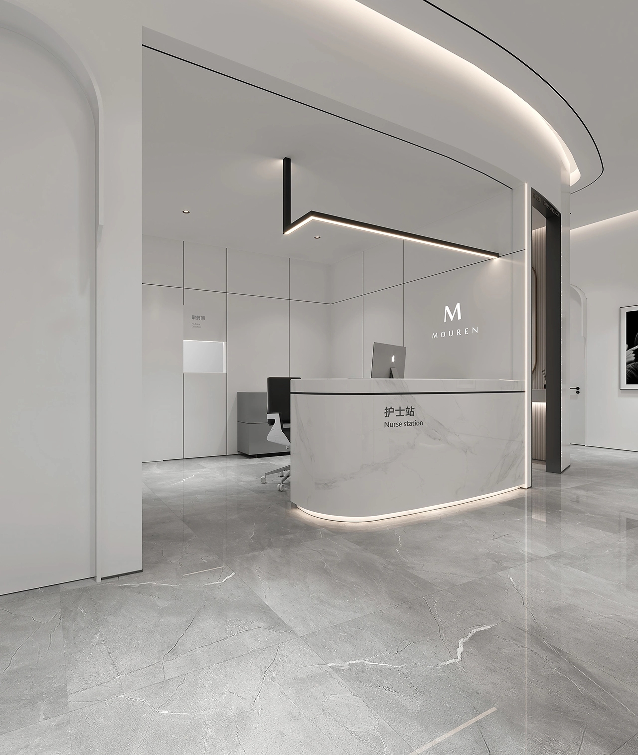 进入通畅明亮的前厅接待区,在空间中,我们运用了有温度感的曲线,柔和了整个空间,以此减少医疗机构一贯的冰冷氛围,缓解顾客首次来访的紧张感。同时白色和深灰金属的搭配,不仅提升了空间质感,也营造了茉翎的专业度。