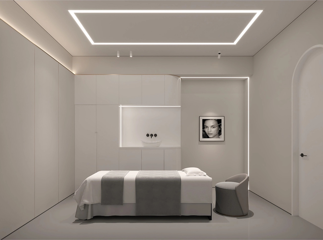 私密性空间与半私密性空间在空间布局中合理划分,又整合连接,使空间更加丰富变化,并削弱狭窄空间带来的局促感,使顾客与医生之间既有良好的沟通,也拥有足够的隐私。同时室内空间采用了低调的白色,为美容服务提供了干扰最小的色彩环境,减少了顾客的紧张和不安感,让咨询和问诊都能够顺利进行。