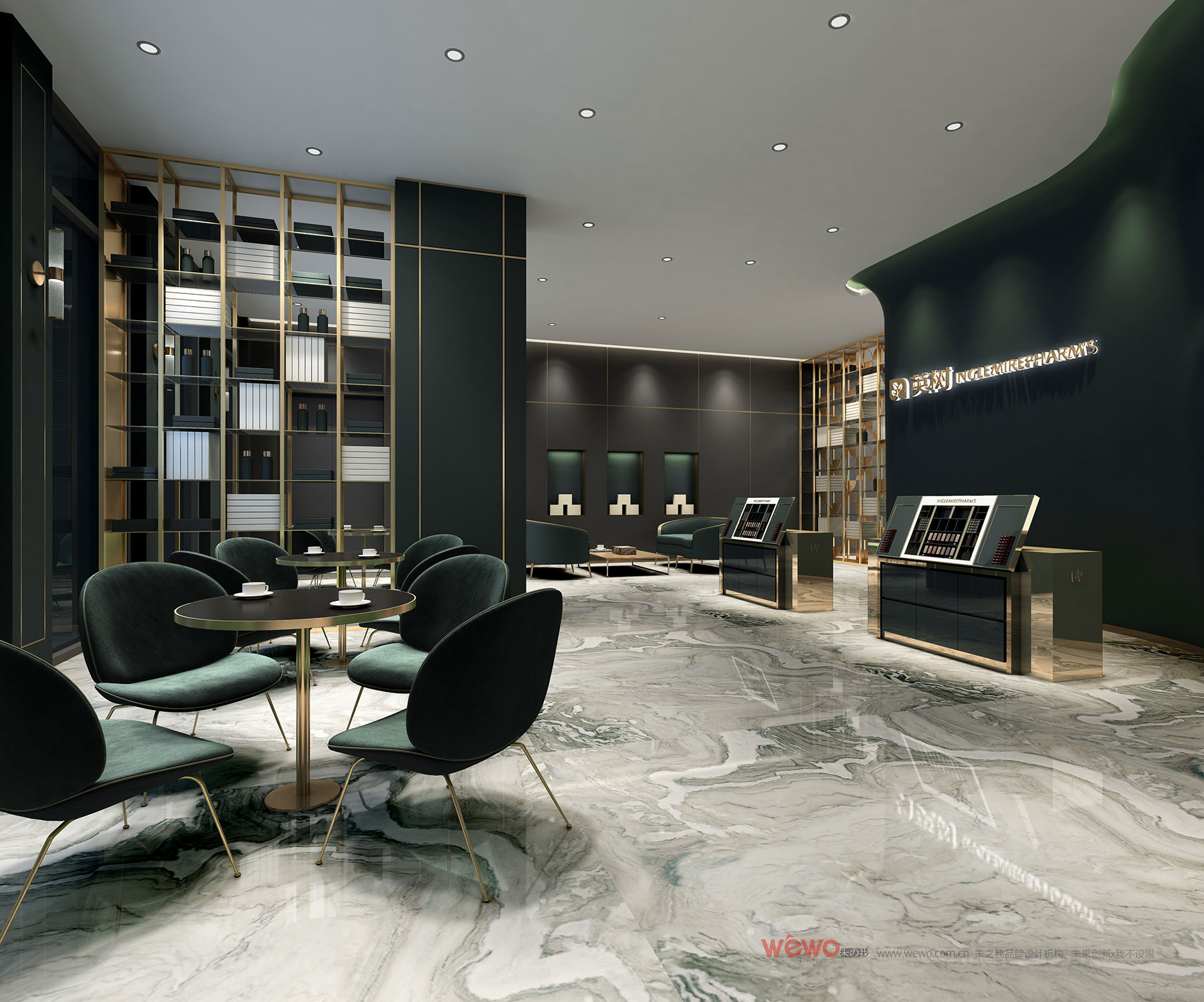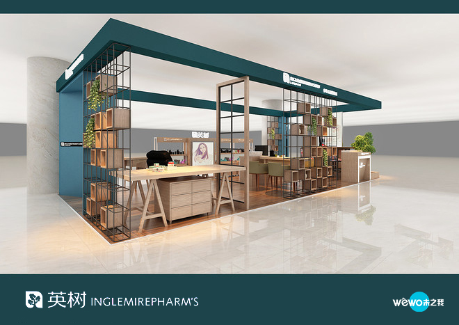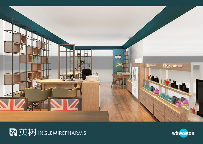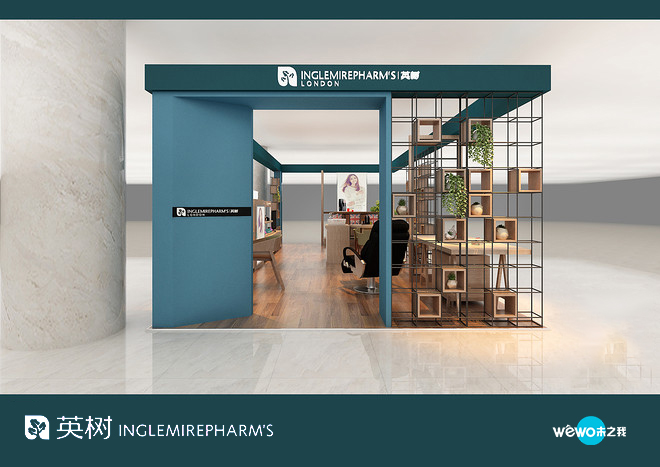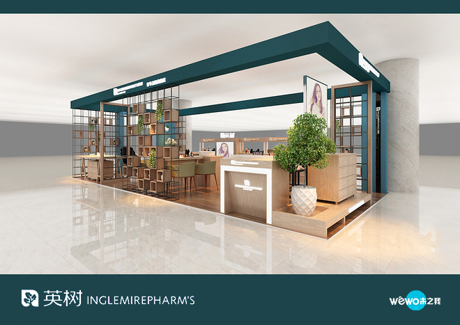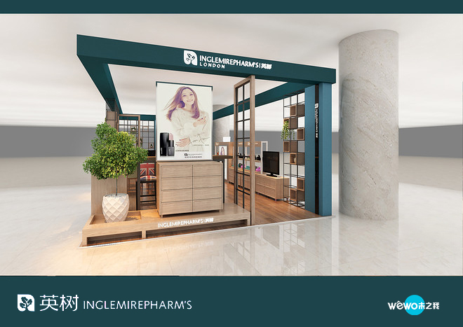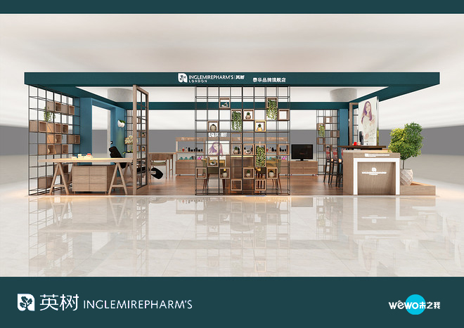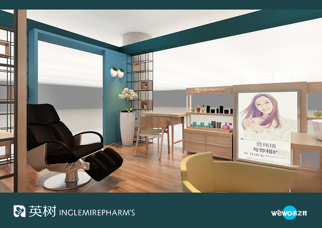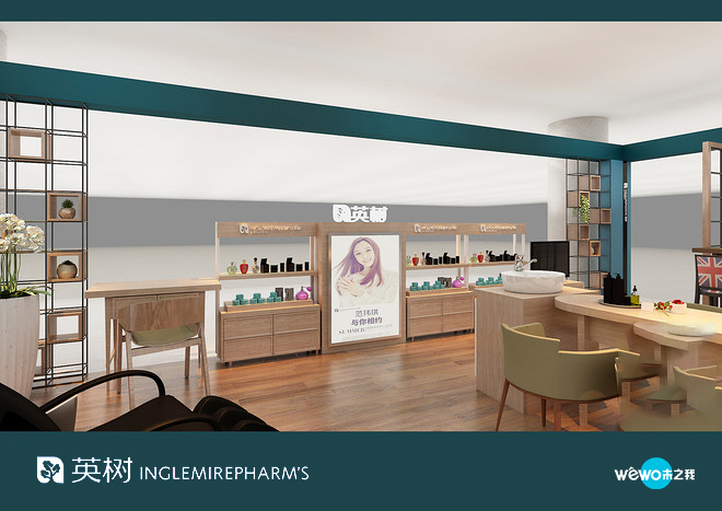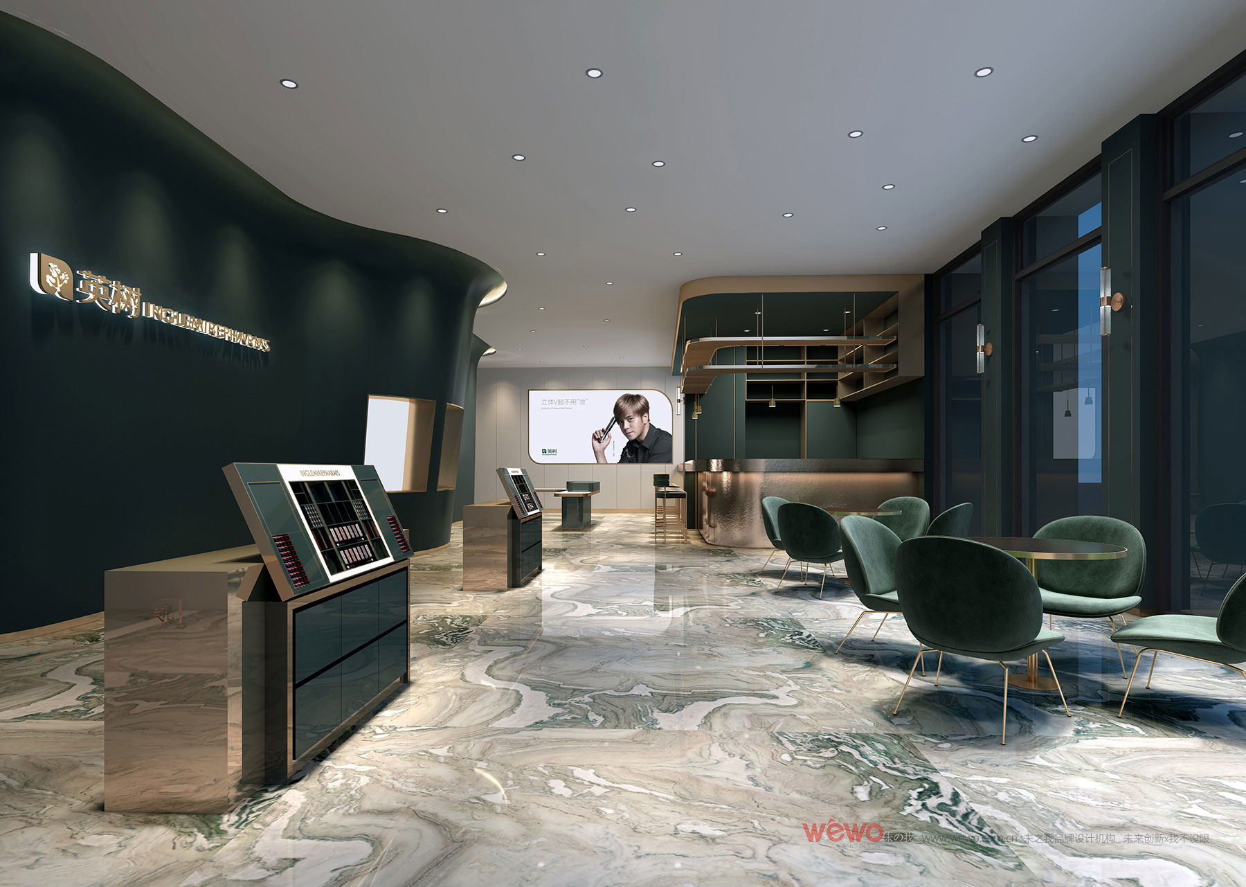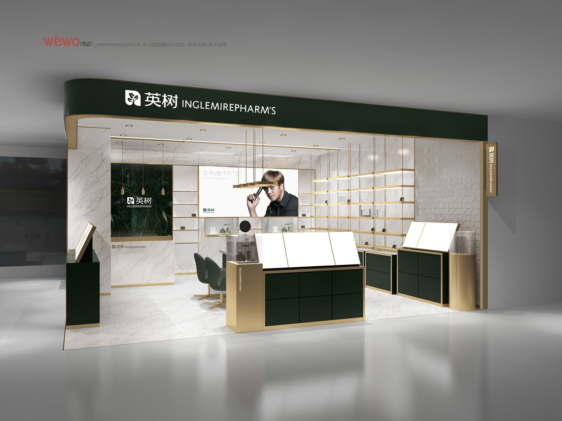 连锁专营店:整体以白色基调为主,墙面上大量采用爵士白大理石以凸显空间品质,主背景设计中提炼出英树品牌中“树”的元素结合LOGO外形轮廓,以抽象的形式表现;