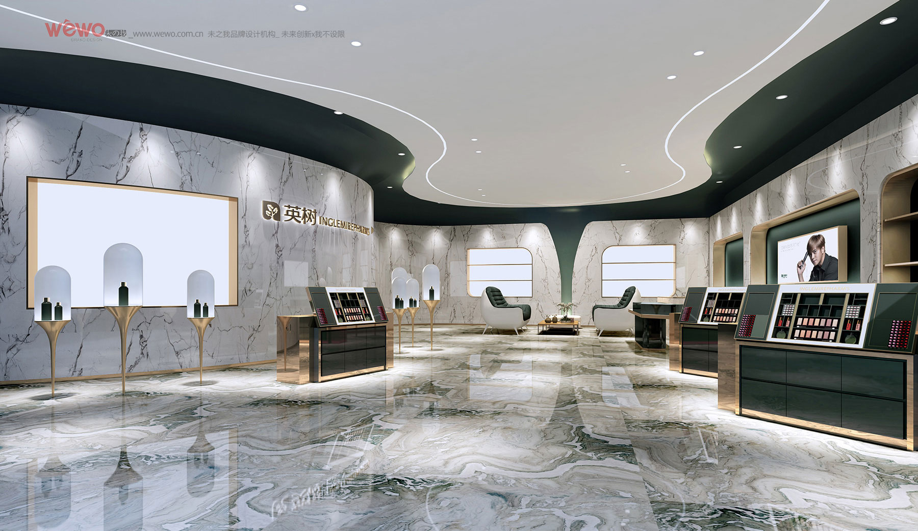 商场标准边铺:立面门头使用墨绿色方案配白色正发光广告字,突出字体形式,与室内背景形象相呼应;室内空间以白色为基调,以道具材质与颜色做点缀;