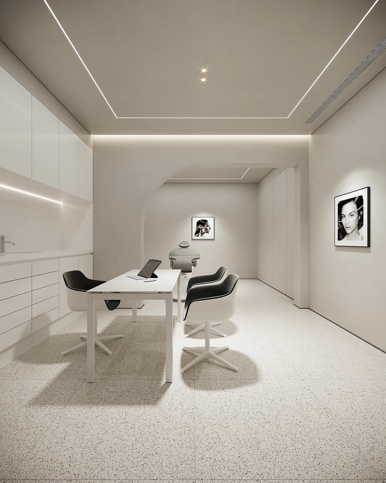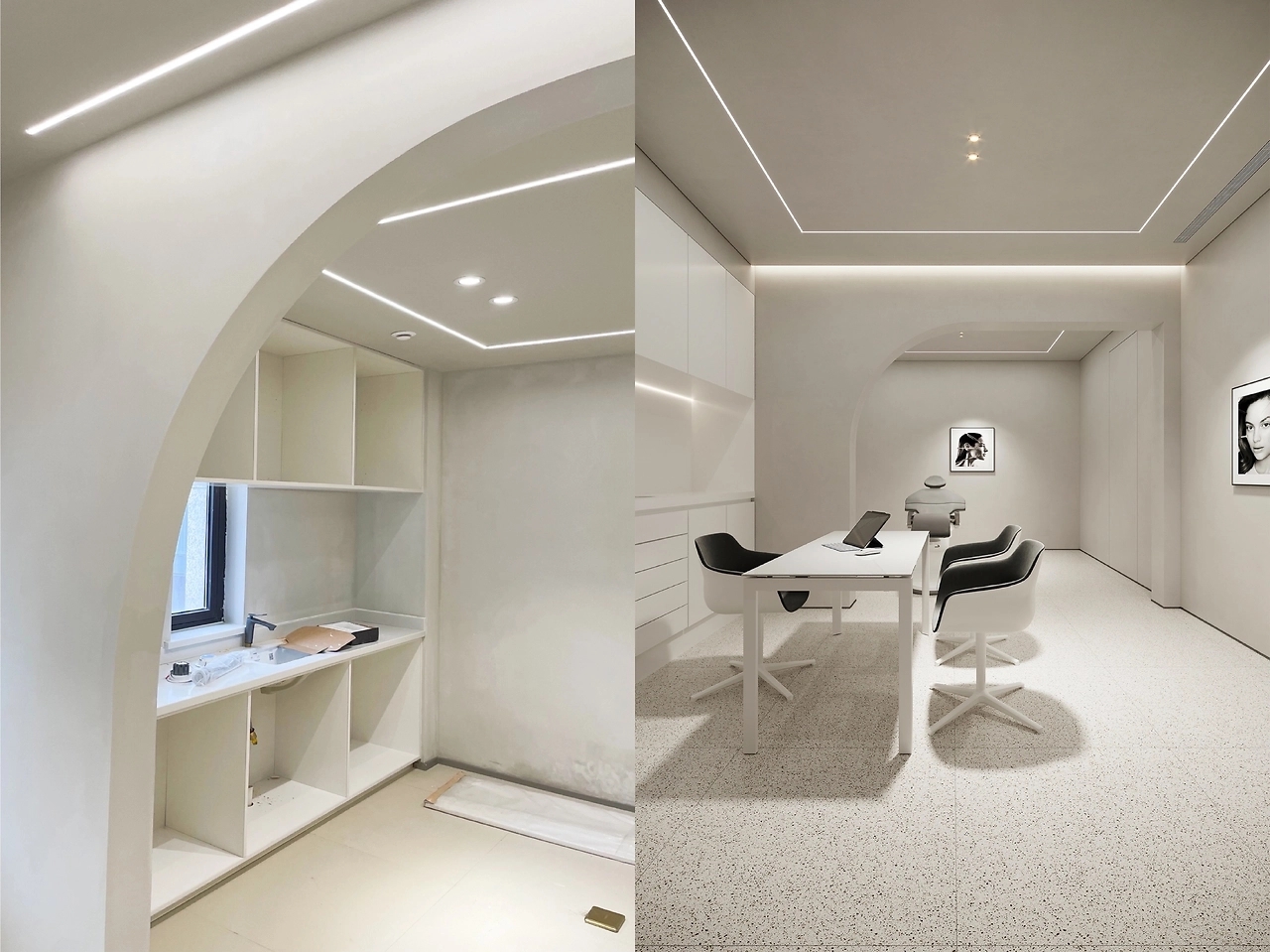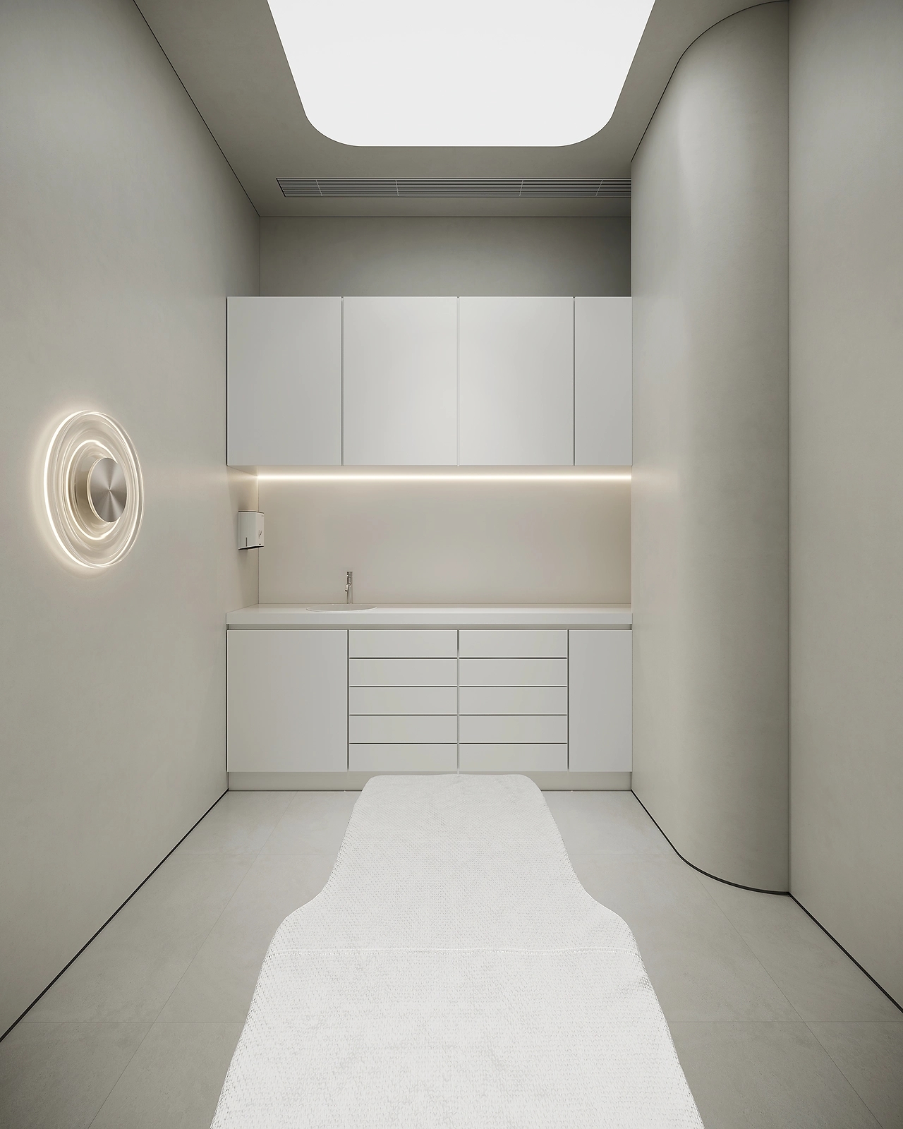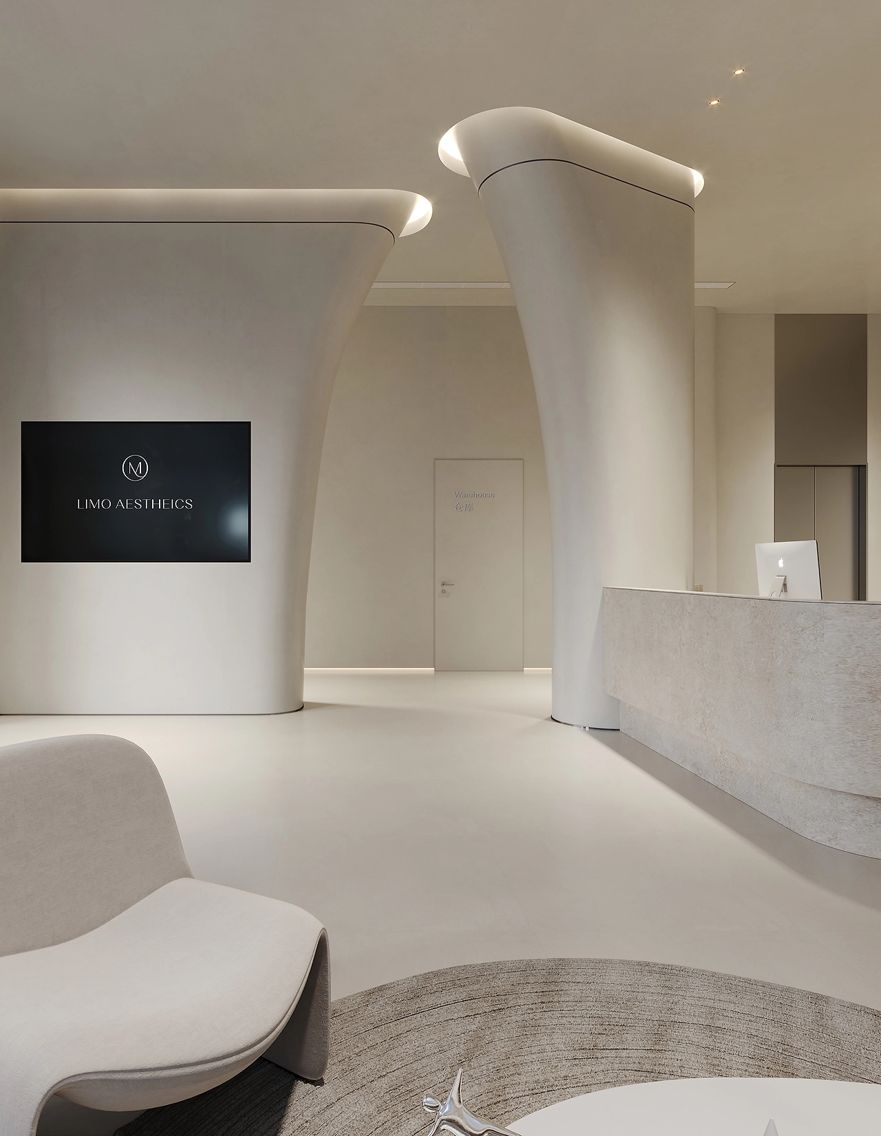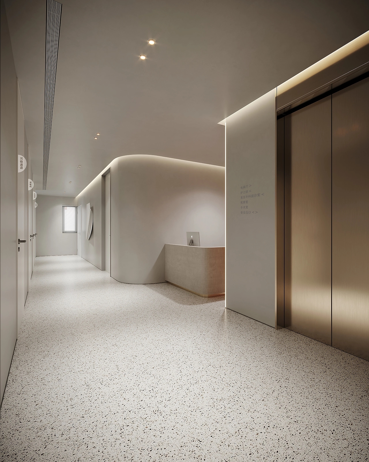 二层为美容皮肤科区域。以灰白为主色调,用灯带勾勒空间,灵动的曲线设计无处不在,整体呈现温和的科技感。宁静的氛围给来访者一种舒适感,不杂不躁,如沐春风,给人以信任感。