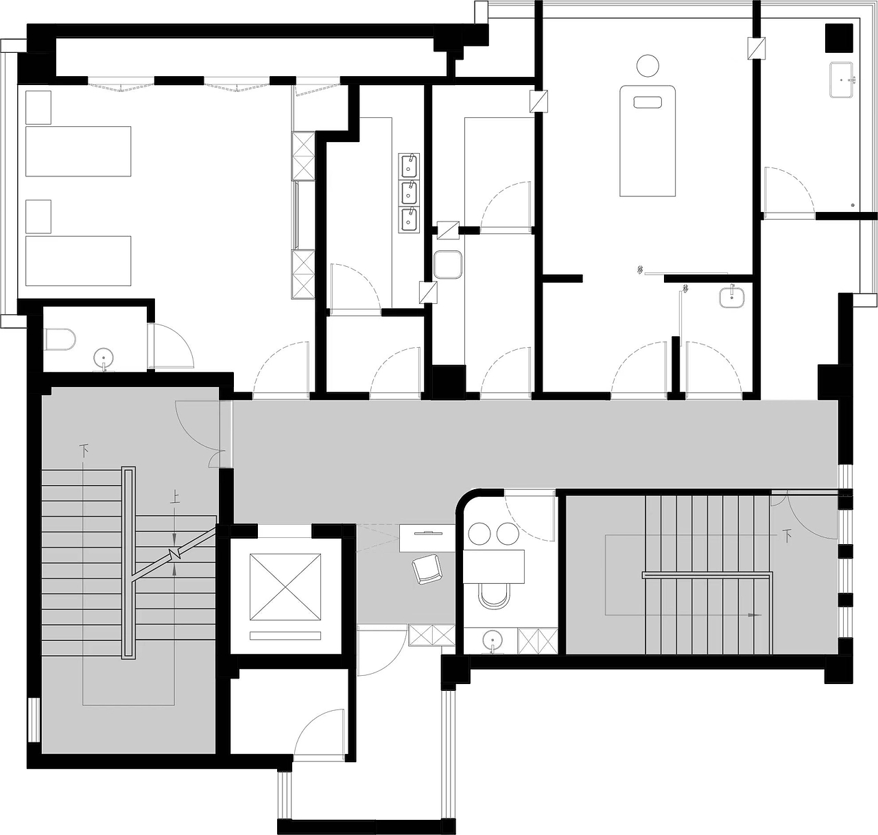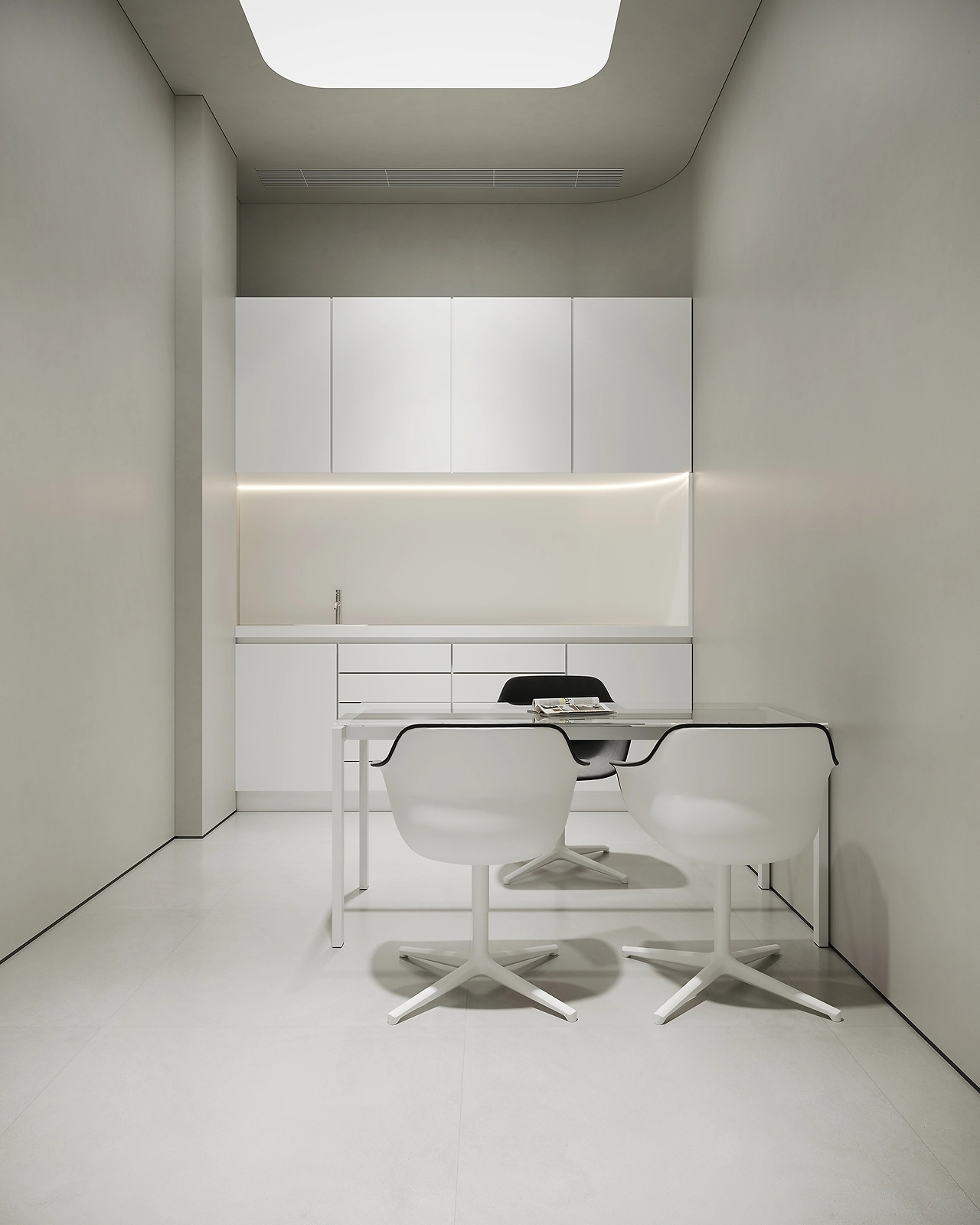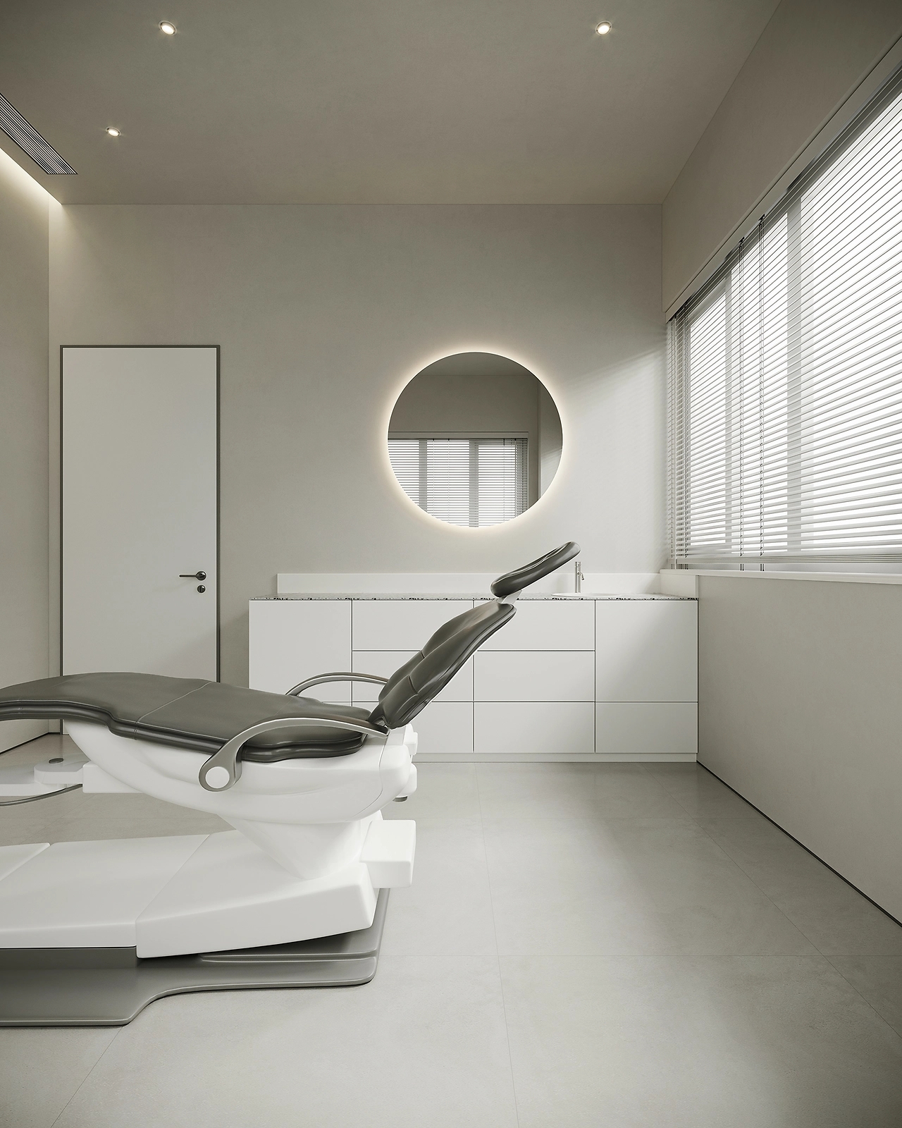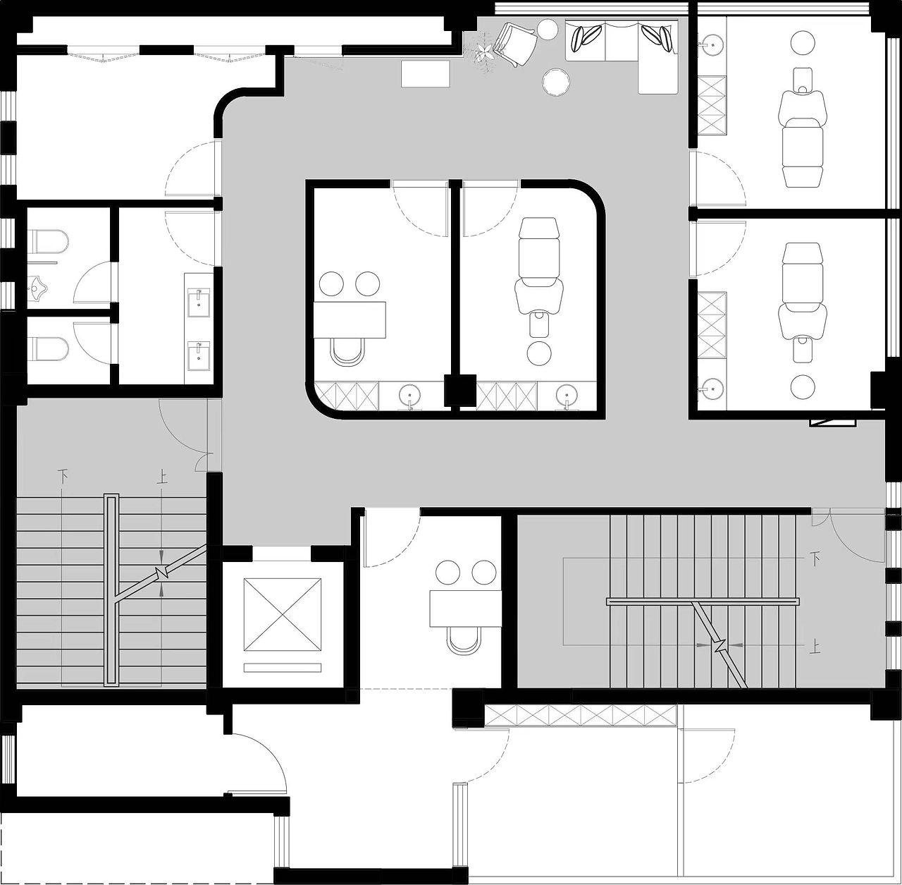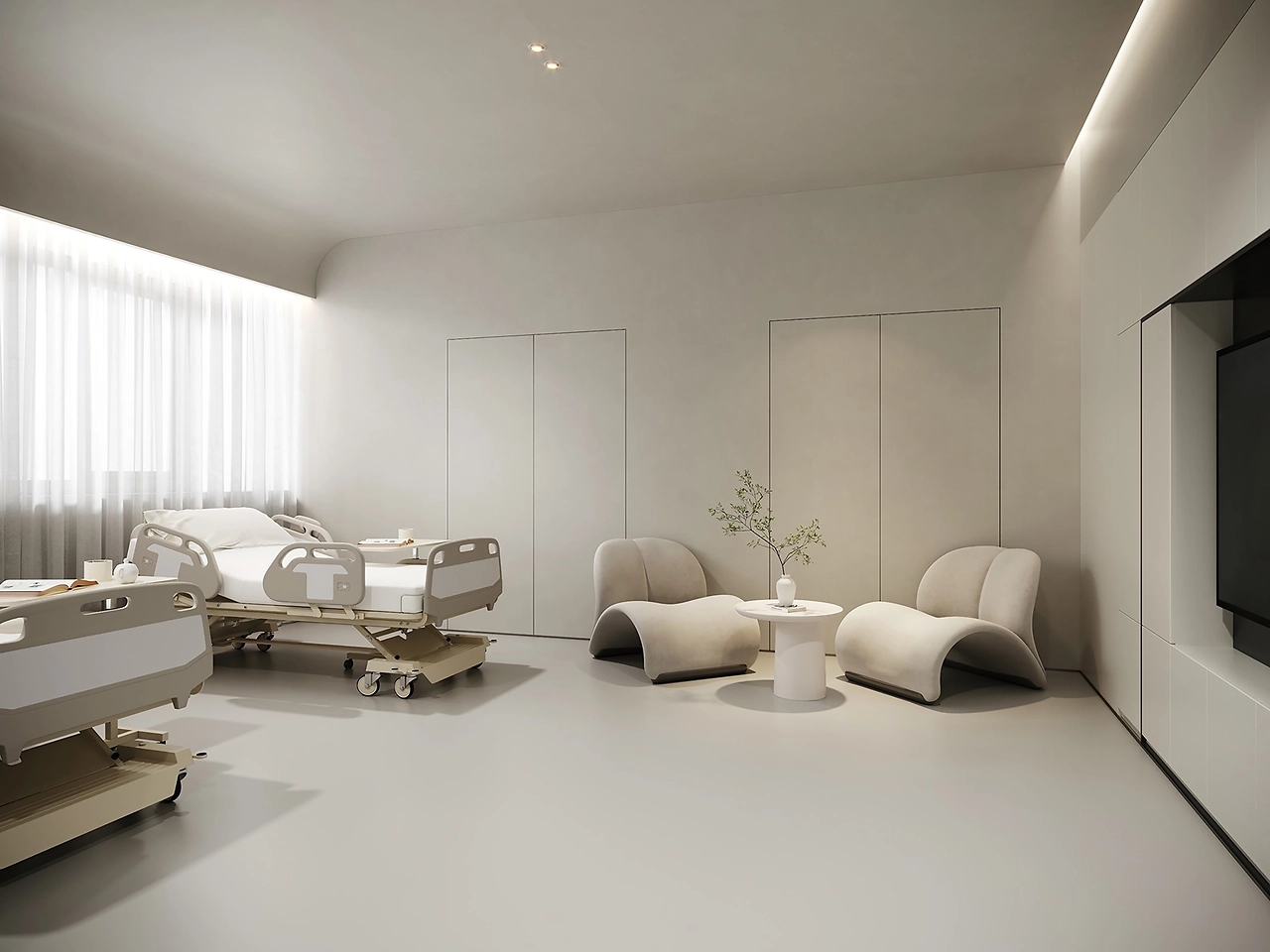 二层为美容皮肤科区域。以灰白为主色调,用灯带勾勒空间,灵动的曲线设计无处不在,整体呈现温和的科技感。宁静的氛围给来访者一种舒适感,不杂不躁,如沐春风,给人以信任感。