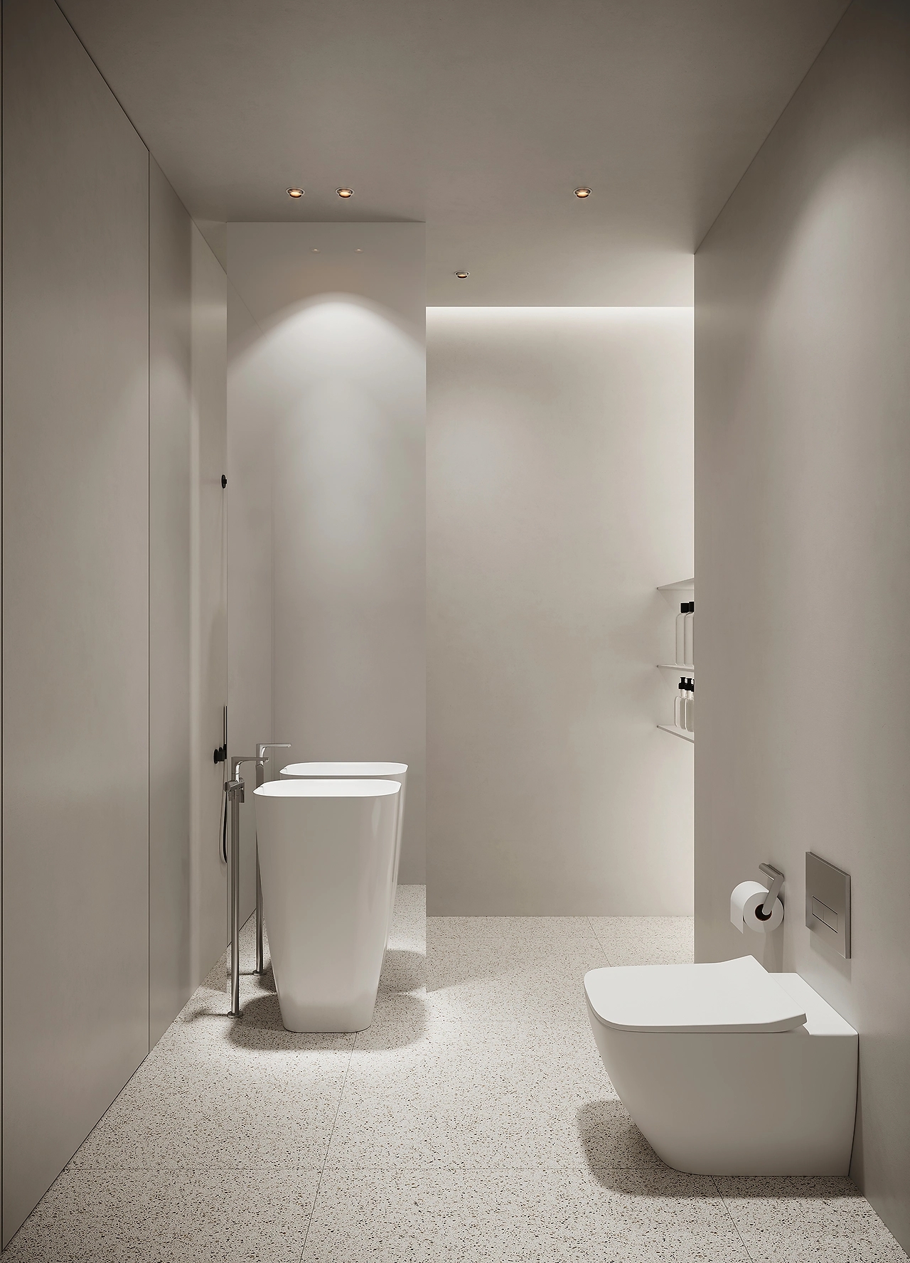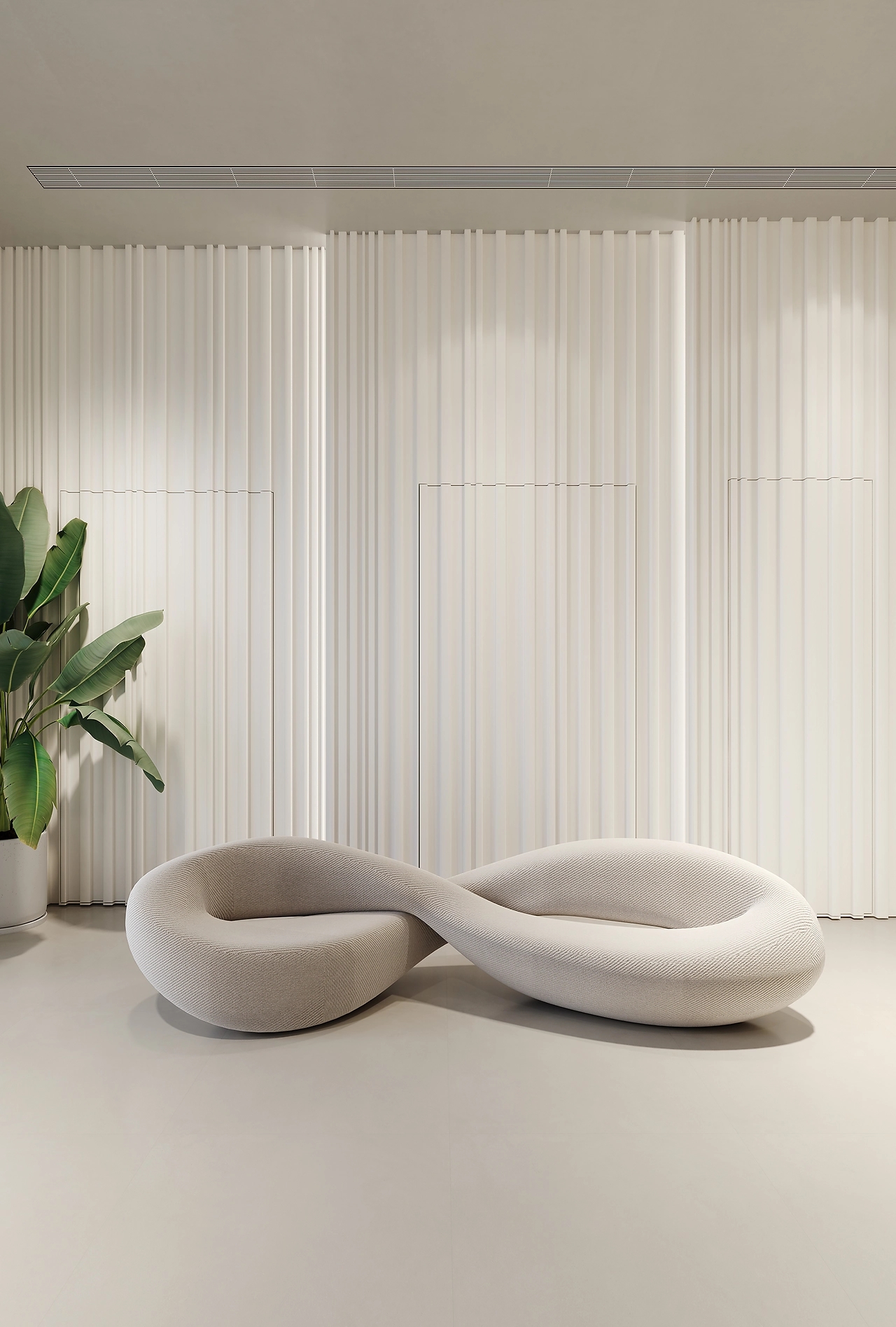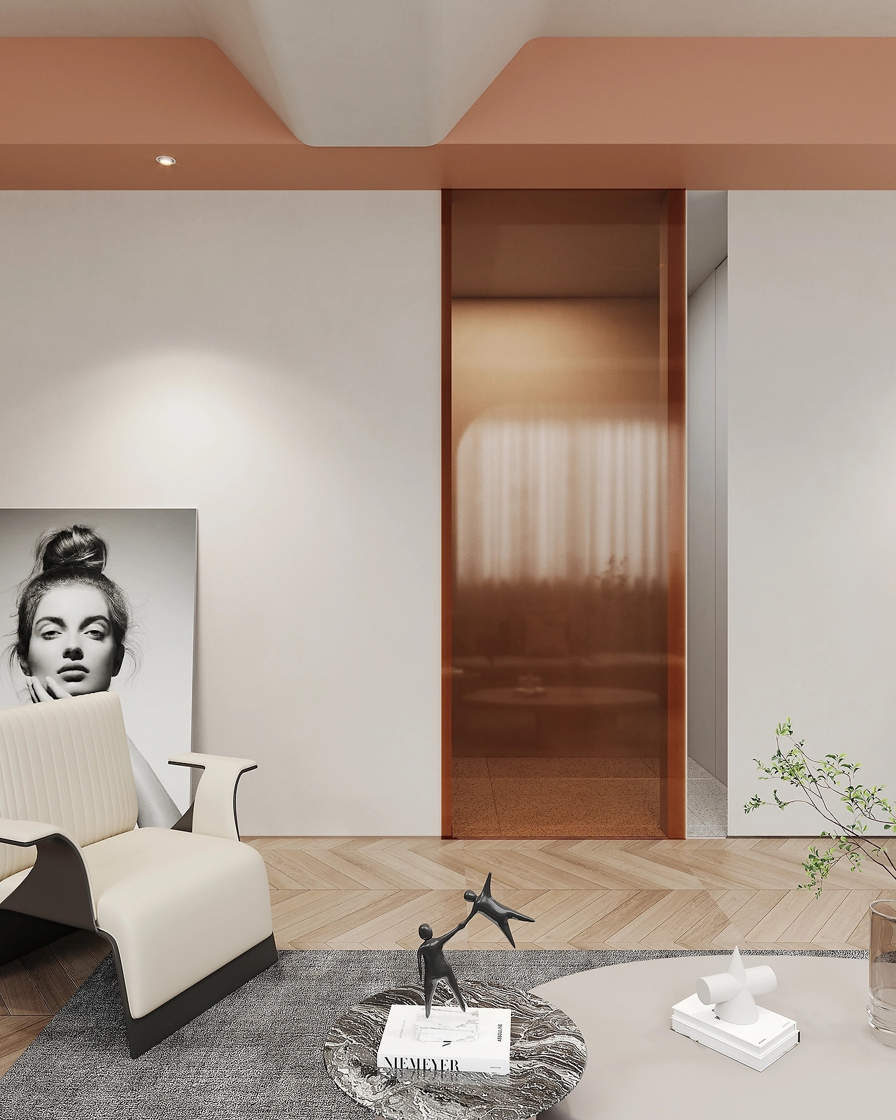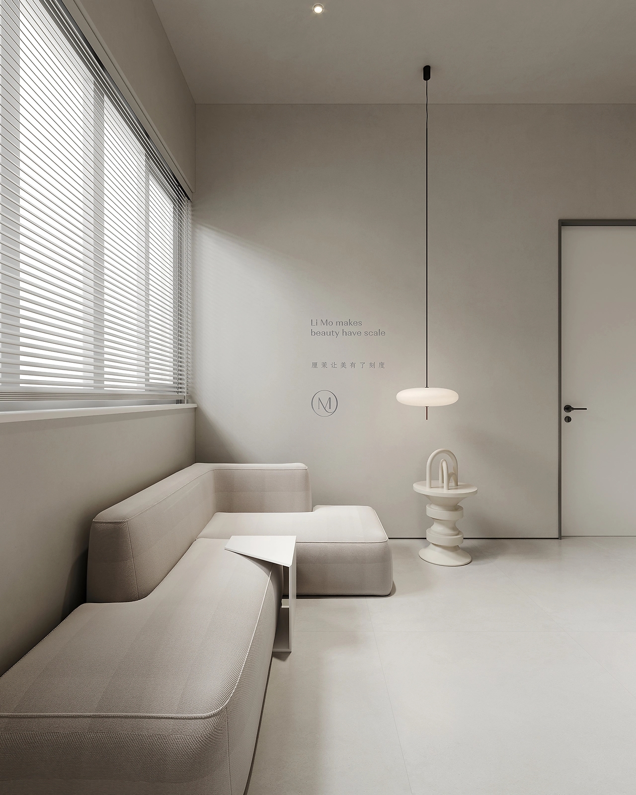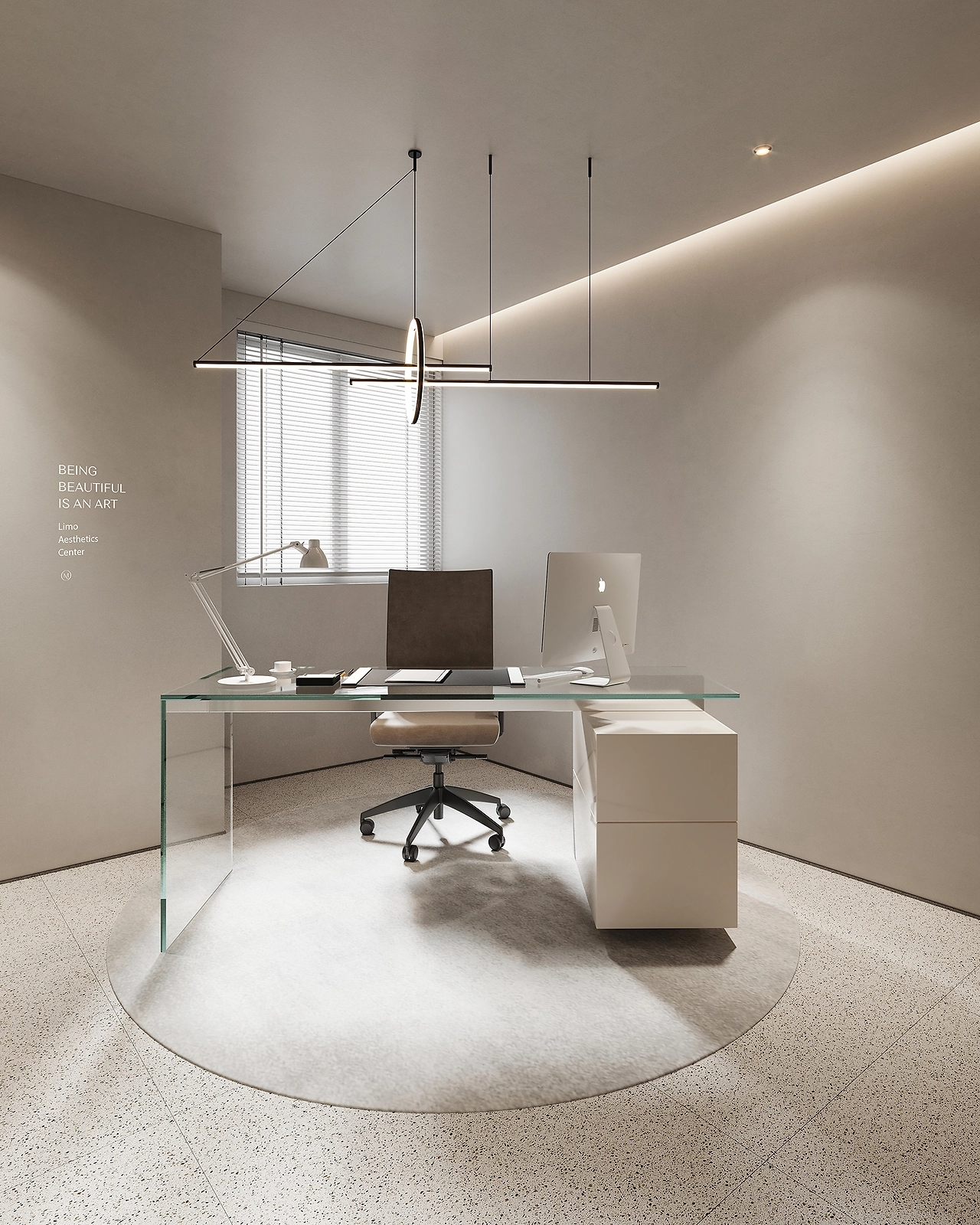 纯白的空间内,利用多种结构的设计手法以及不同材质间的差别,令空间丰满而具有艺术气息。在一侧设计了两个曲面墙体作为分隔,曼妙的线条呈现优雅而精致的空间,并利用大面积玻璃,增加了空间通透和光感。