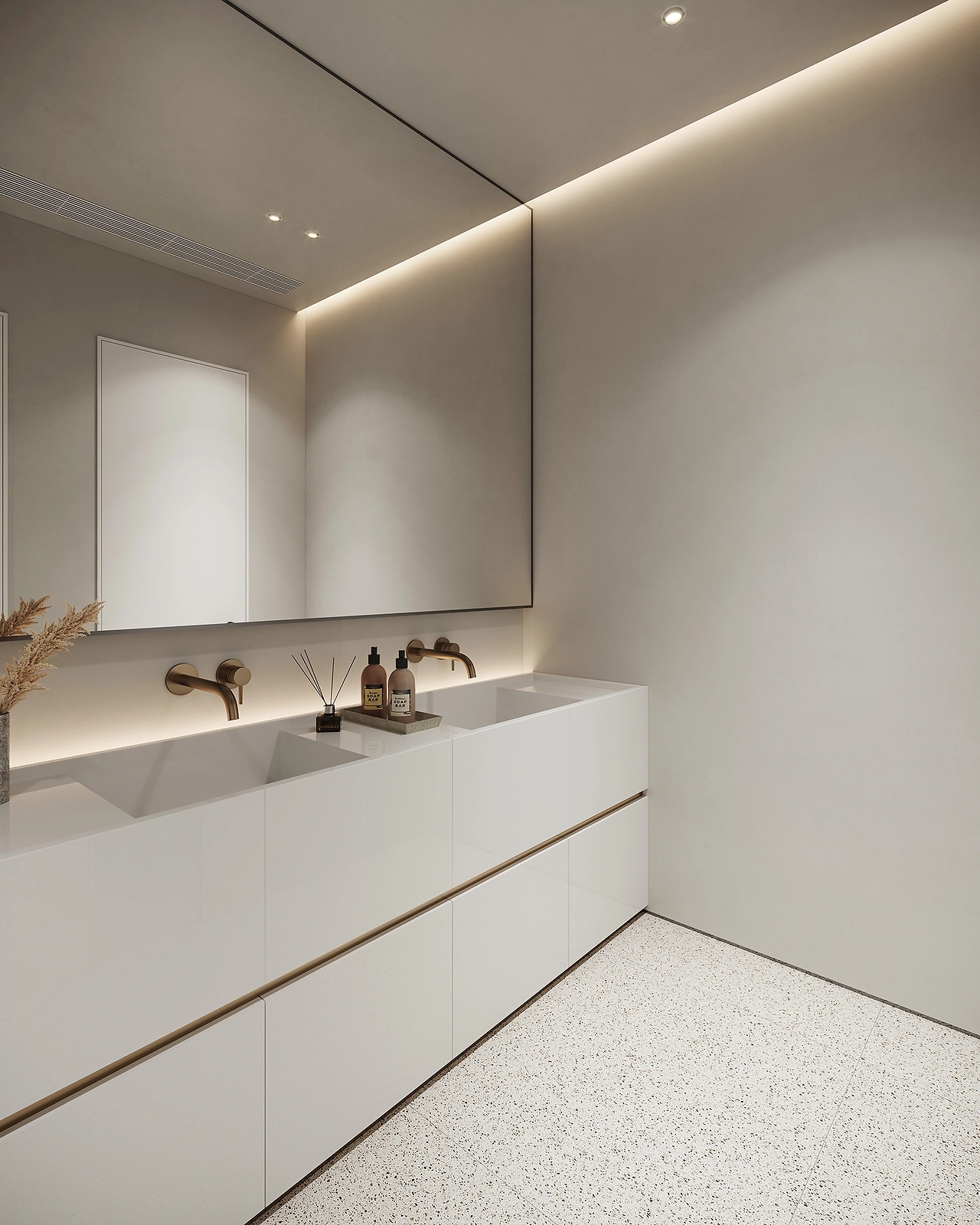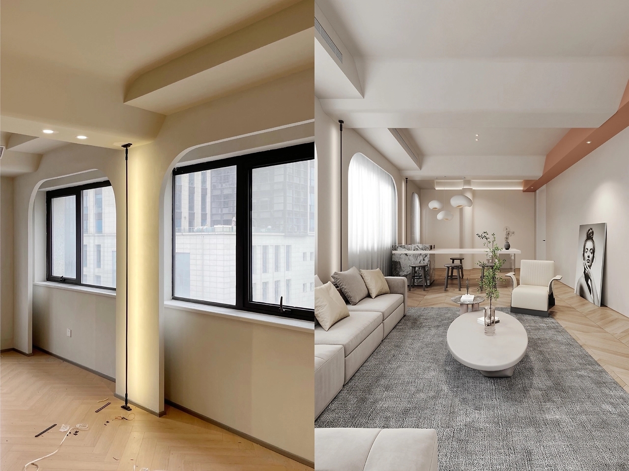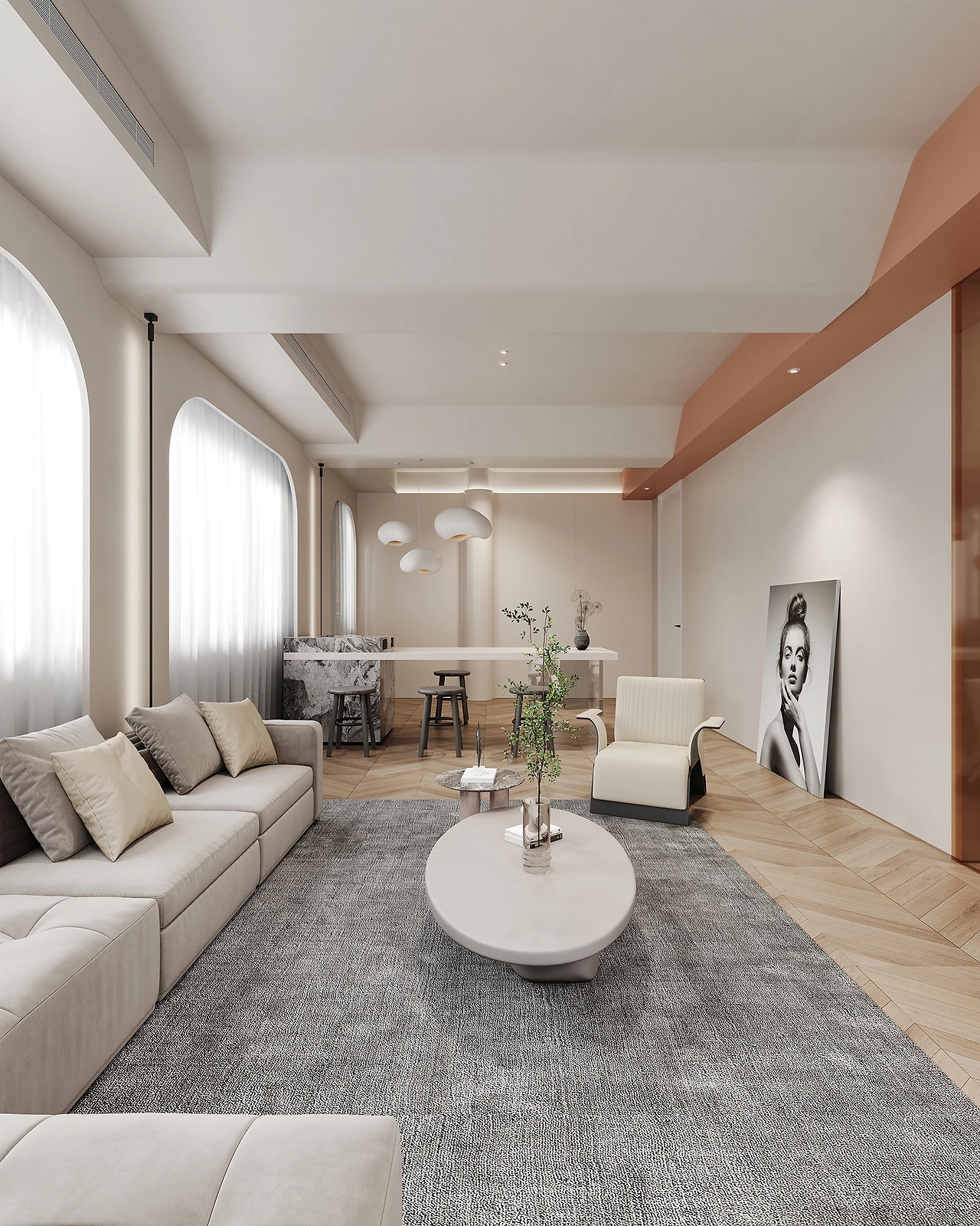 奶油白没有纯白的冷肃,是安静柔美的,灰色则是沉稳的,包容着一切,二者结合,于无声中展示着温柔的力量。同时利用少许黑色、咖色,赋予空间多重视觉体验。