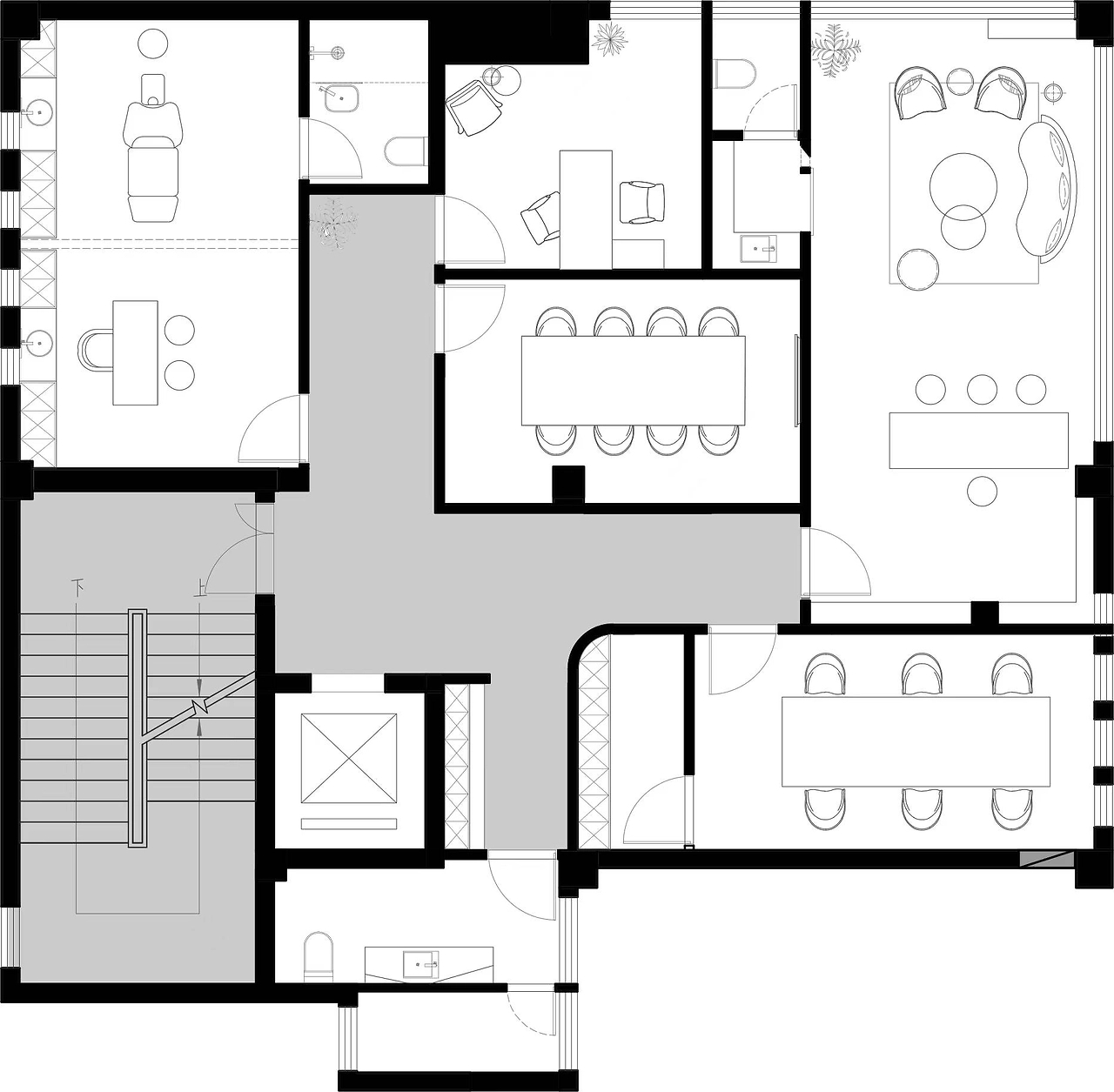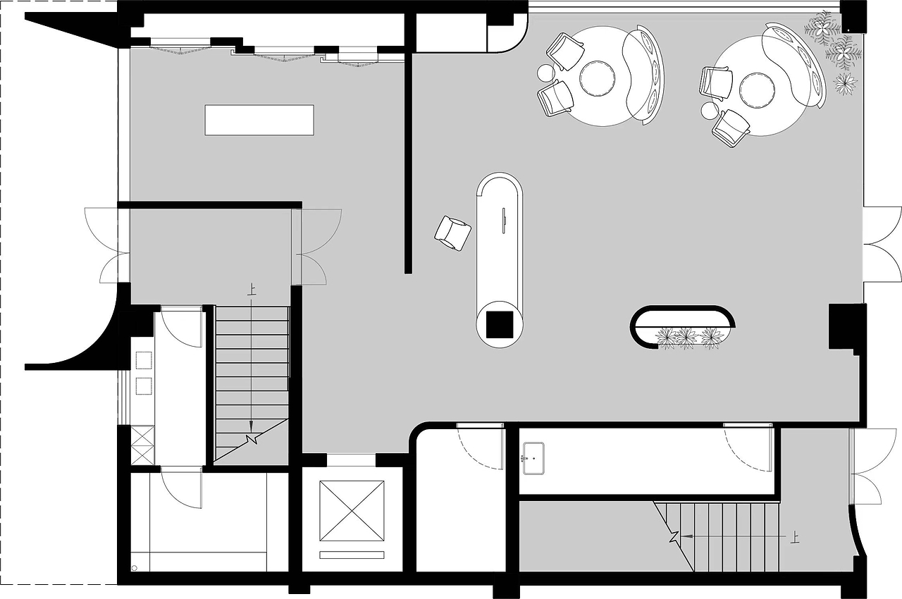 四层为VIP区域,同时设有内部工作区域。明亮通透的VIP等候区内铺设有木质地板,搭配绒感沙发组合、大理石台面,舒适而自在。其他区域的设计则是简约的、平和的,延续着整体的设计风格,以点、线、面为基点,从结构上和材质做出改变,保持着空间的私密性。