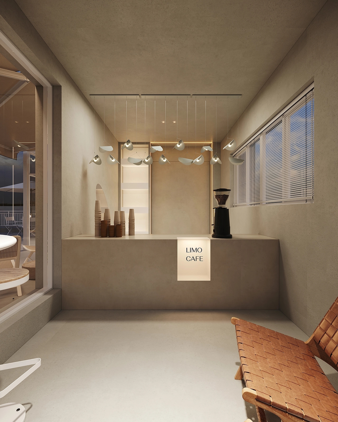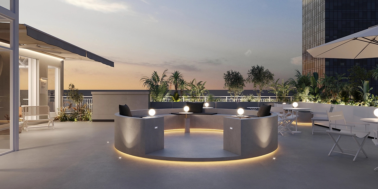 露台集合了咖啡茶饮吧以及休闲区于一体。咖啡茶饮吧的设计简约也颇具风格,简单的微水泥吧台和椭圆形的镂空墙面构成了这个小空间。室外休闲区配卡座和桌椅,可以一边享用咖啡,一边眺望远方的景色。