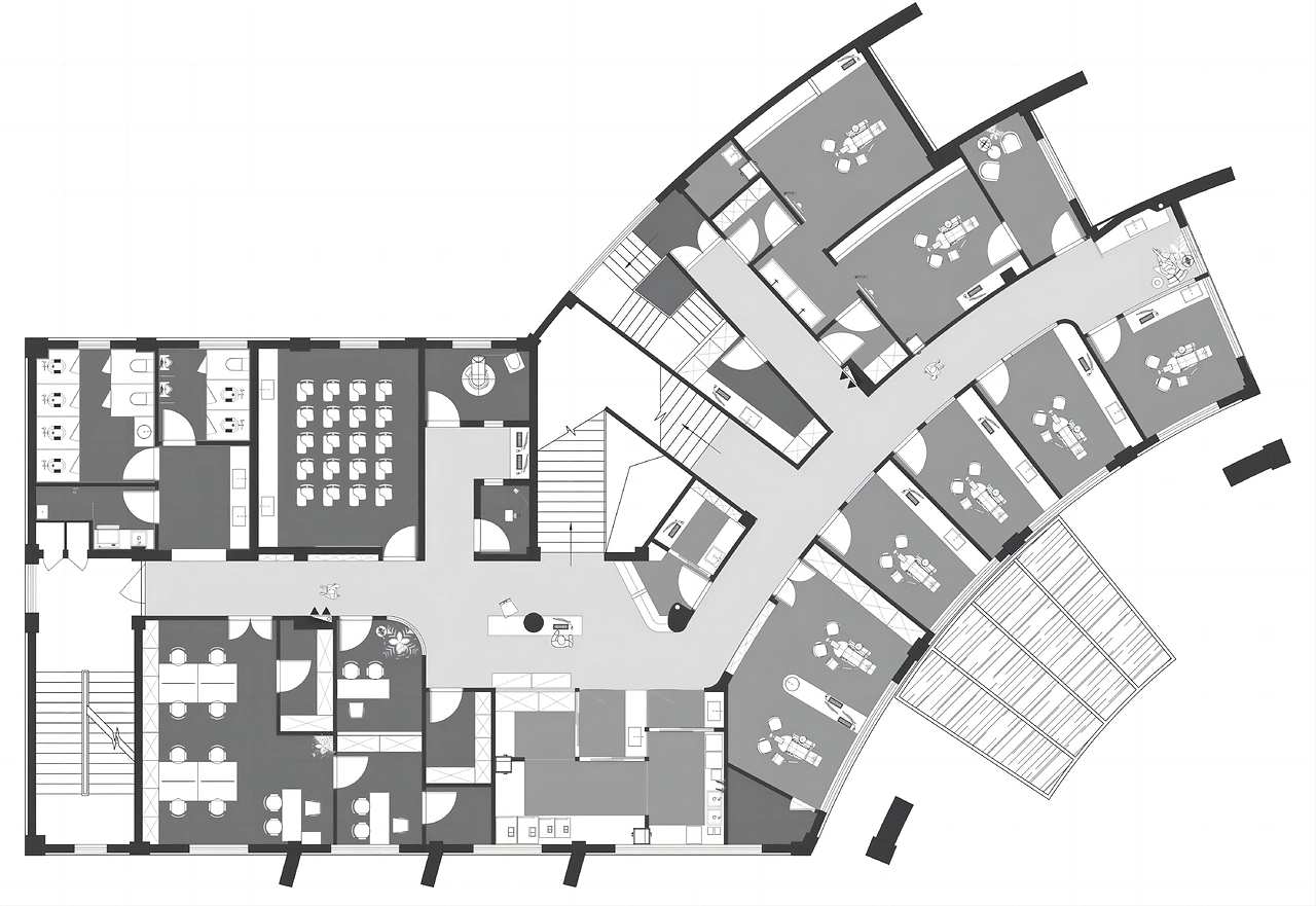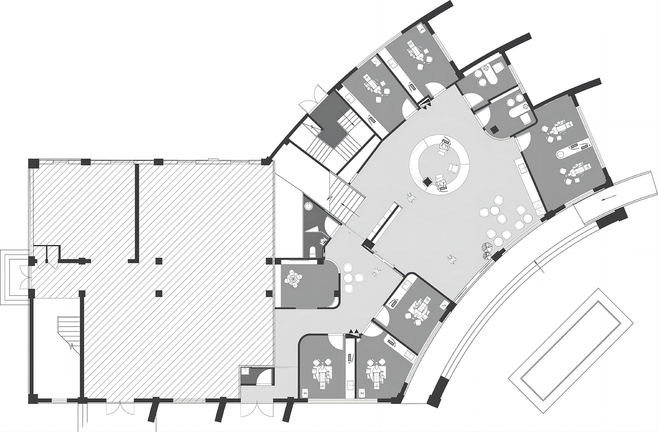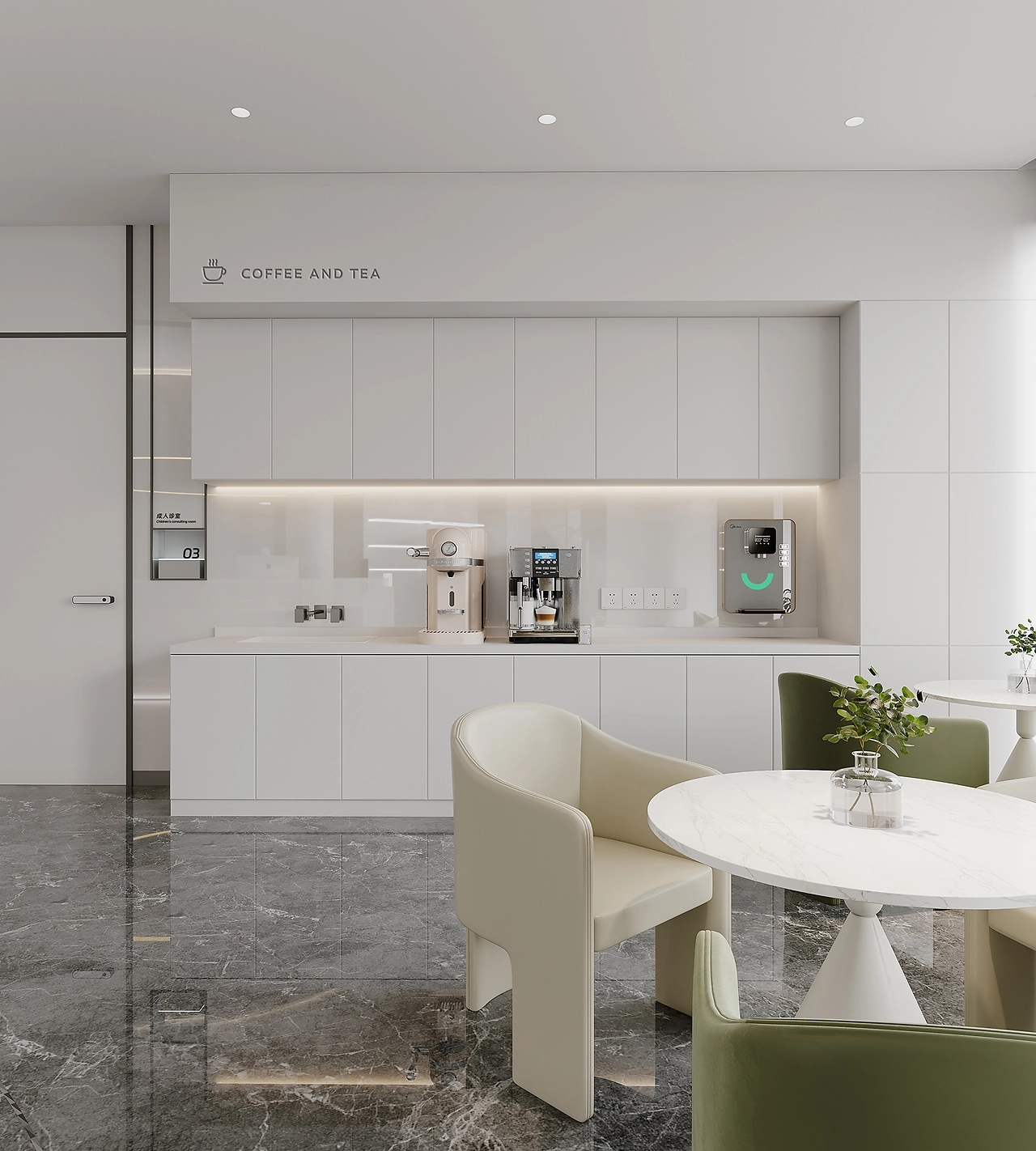 洽谈间由半透明玻璃构成,独立却不完全与外界分割,能捕捉到光线、人影,营造朦胧而平静的氛围,为来访者增添安全感。