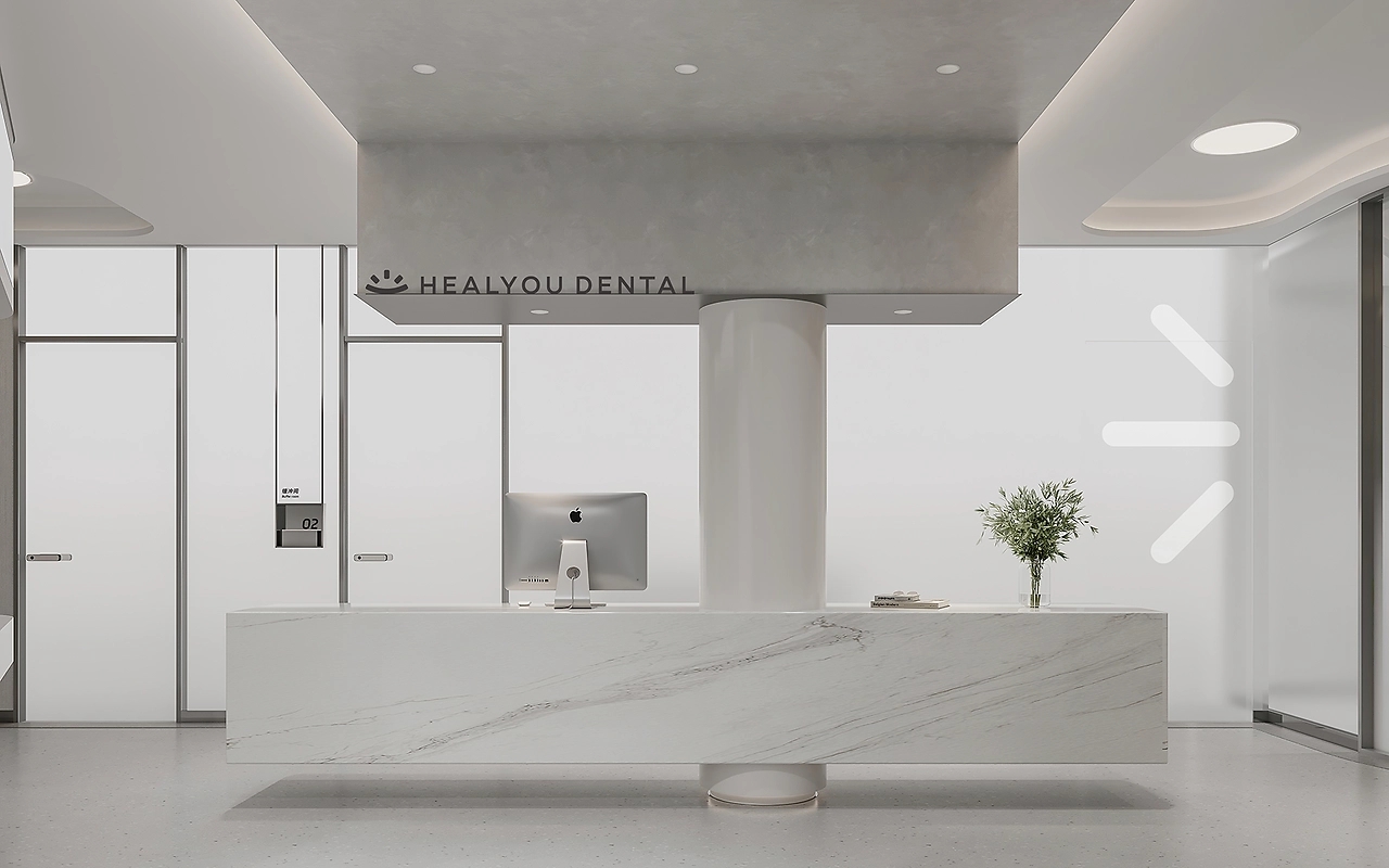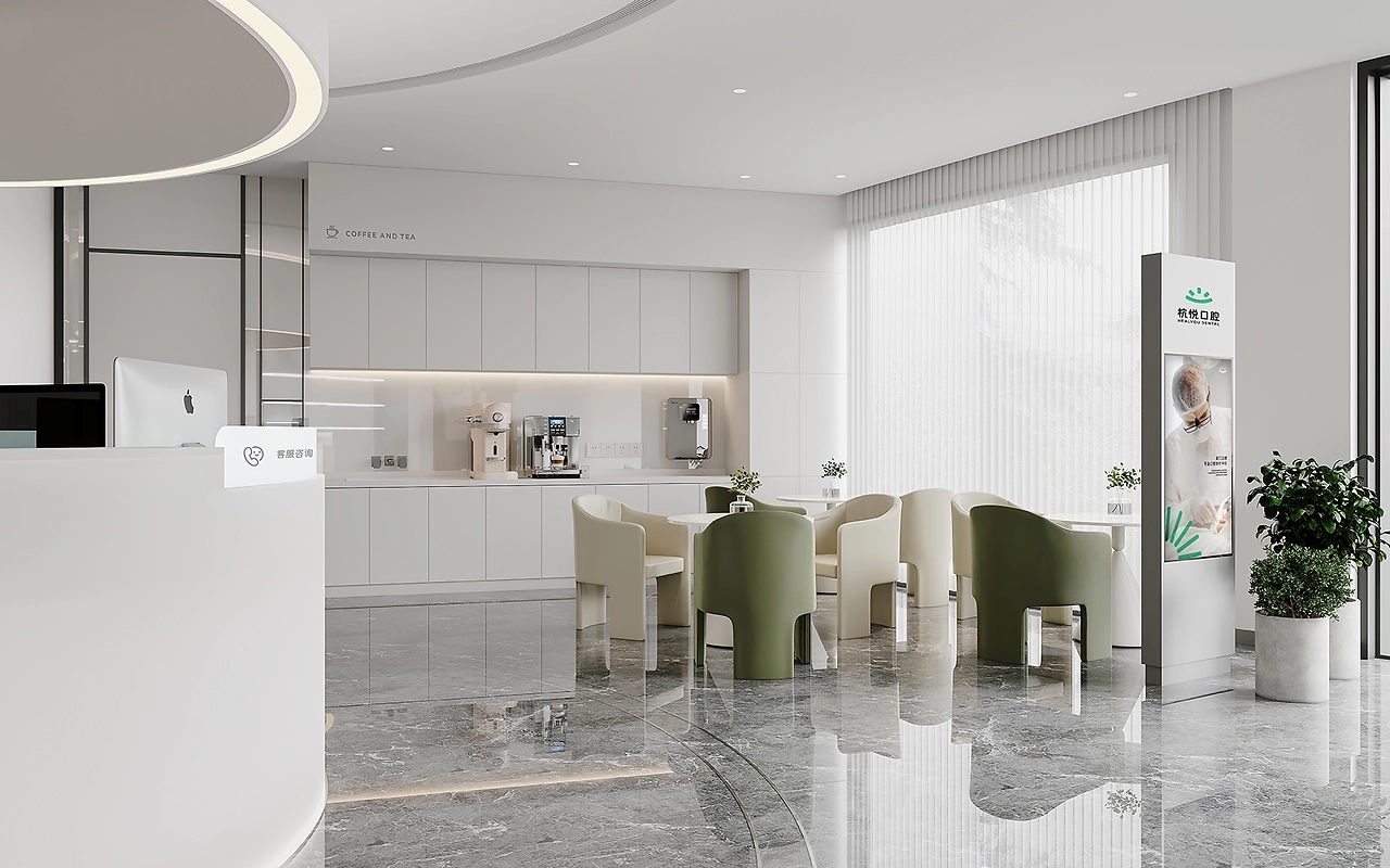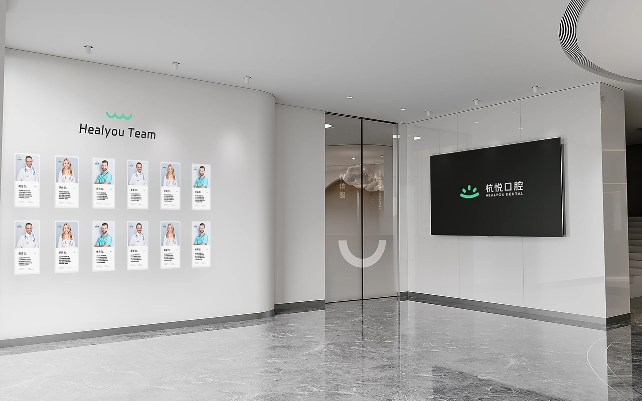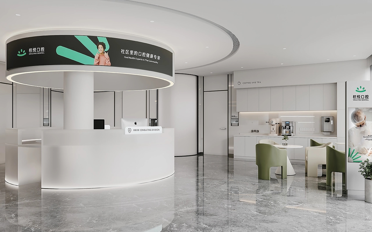 杭悦口腔邻近社区,简约醒目的门头体现着口腔医院的专业性。并且,在入口处放置绿植,淡化医疗空间与来访者的距离感,传递友好亲和的态度。