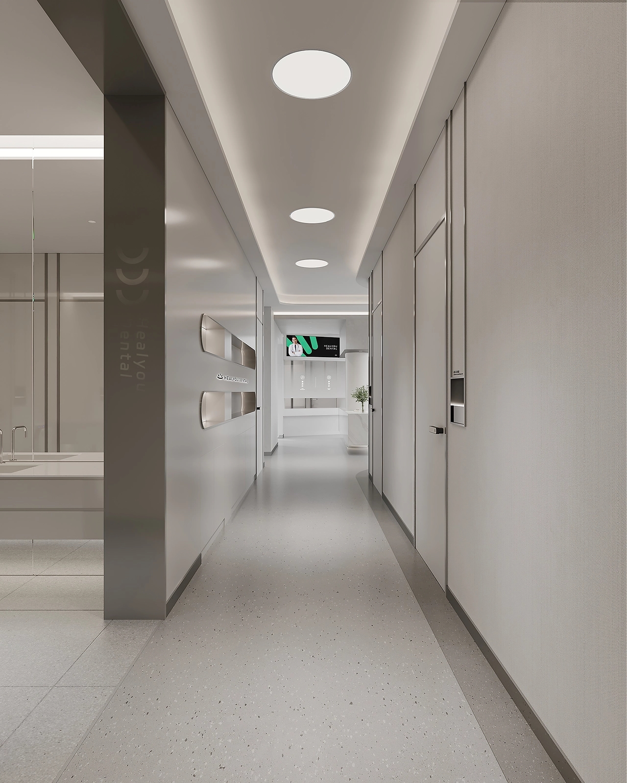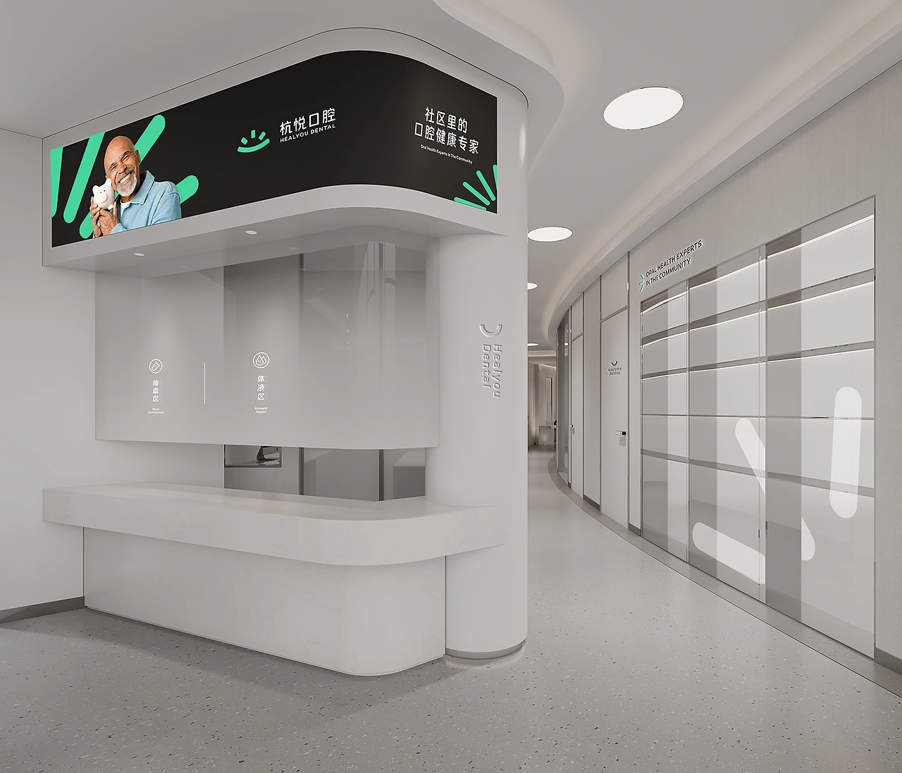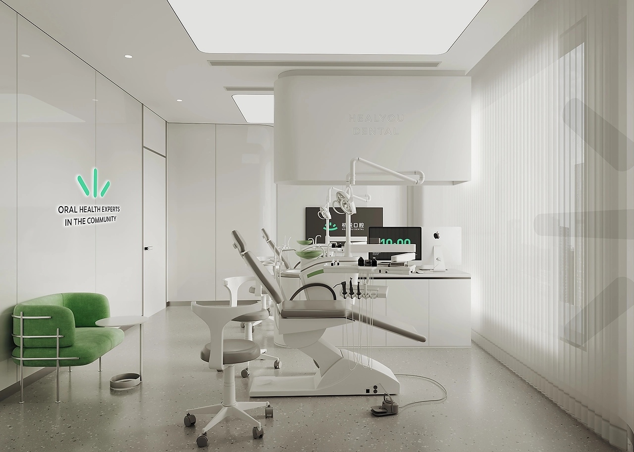 杭悦口腔邻近社区,简约醒目的门头体现着口腔医院的专业性。并且,在入口处放置绿植,淡化医疗空间与来访者的距离感,传递友好亲和的态度。