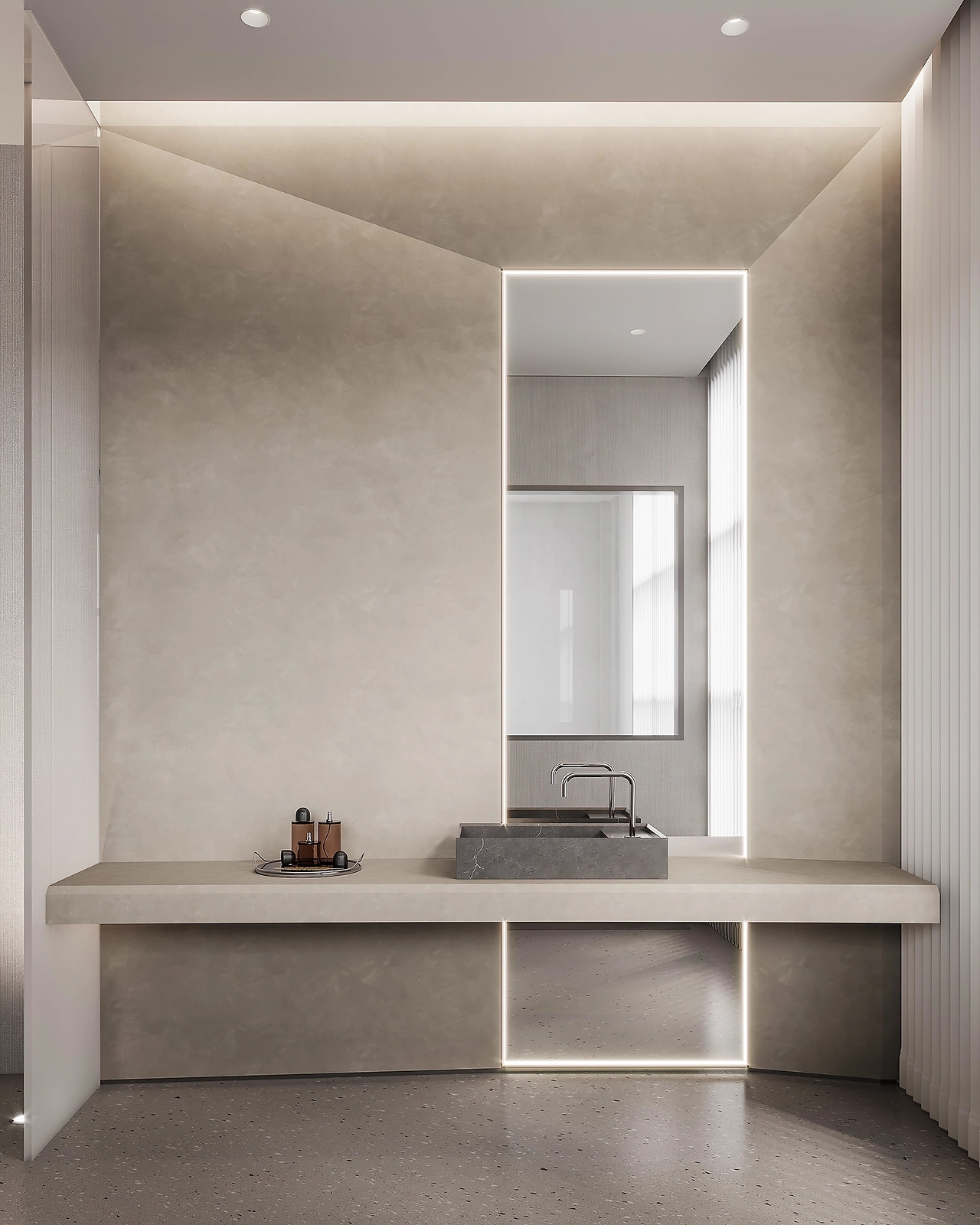 二楼空间传递出温润的精致感,理性与感性的交织,平静中流露出不生疏的亲和力。过道则利用金属带来丰富的墙面变化,减少狭长空间的沉闷,增加科技未来感,带给来访者更好的体验。