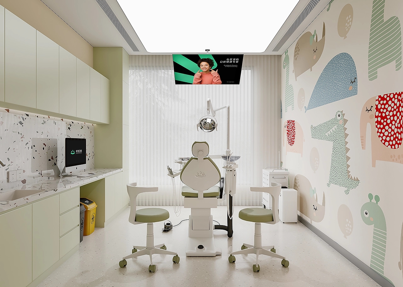 儿童诊室不再是冷静的黑白灰,而是清新的绿色以及童趣插画,安抚孩子看牙时害怕不安的情绪。休息区内,温和的木材包裹的是关怀,传递口腔医院的关爱与责任,简单而温馨。