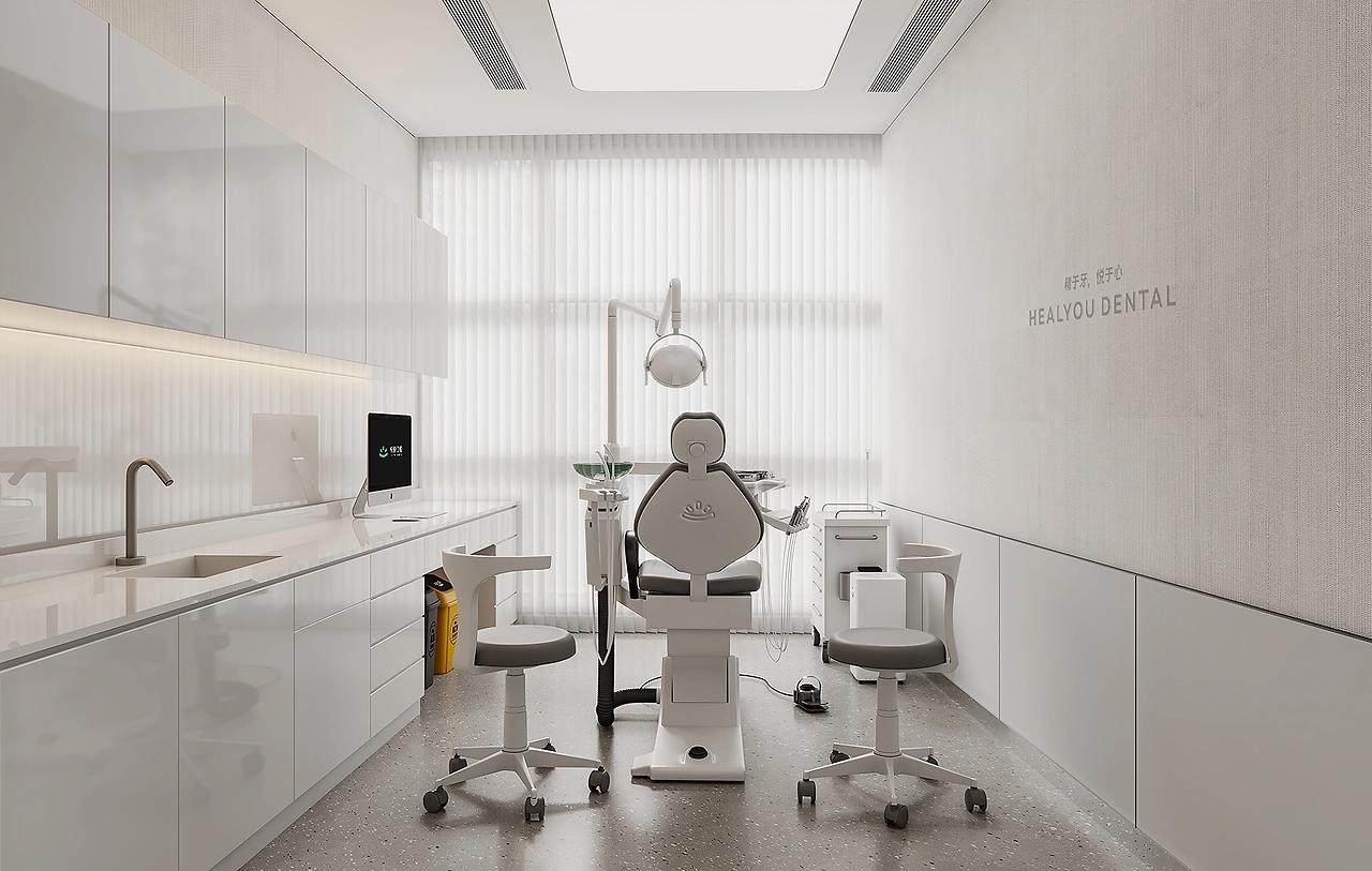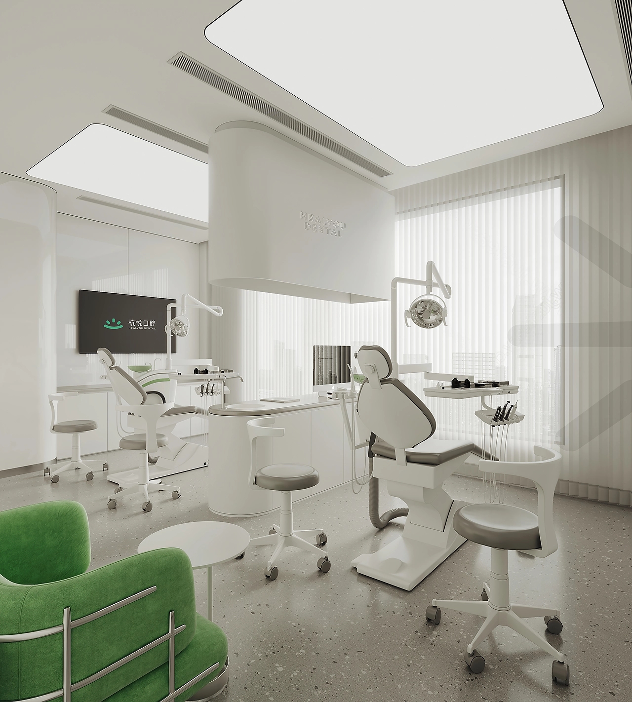 诊室内呈现严谨的秩序感,是理性而可靠的。我们在利落的线条中增加柔和的曲线,于弧度中体会杭悦的贴心。窗将光线引入室内,洁净明亮的视觉感,让来访者产生安心而又放松的联想。
