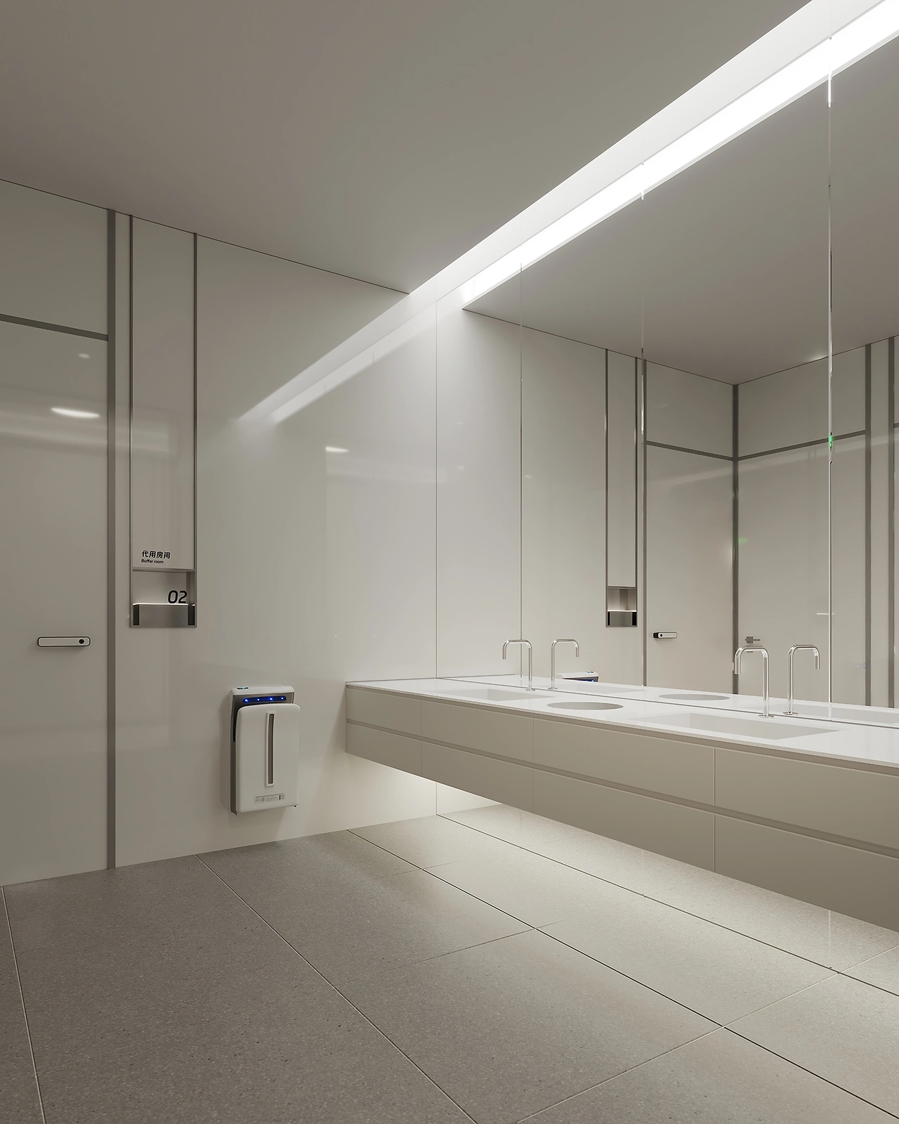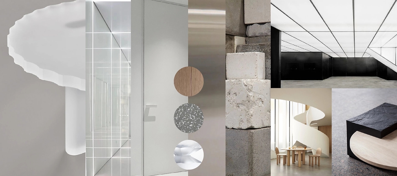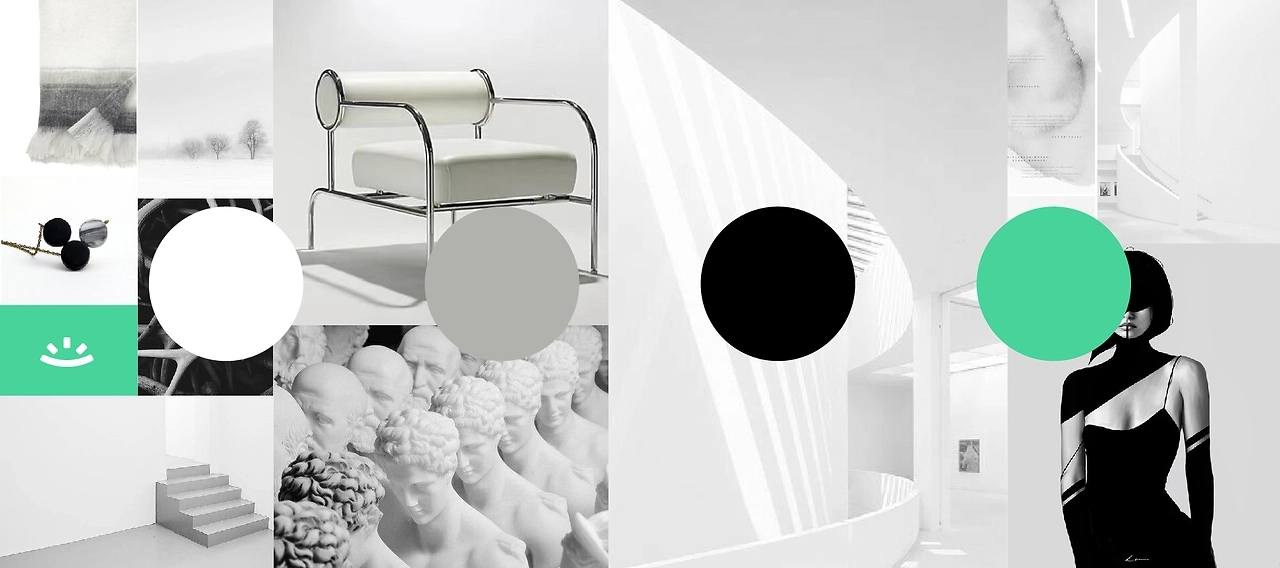 在空间色彩上,我们选择了中性的白与灰作为空间的主要色彩。白色代表的是冷静、严谨,灰色代表的是平和、沉稳,纯粹的色彩,打造品牌所想传达的专业感,同时,点缀少许黑色与品牌的绿色,丰富空间的视觉层次。