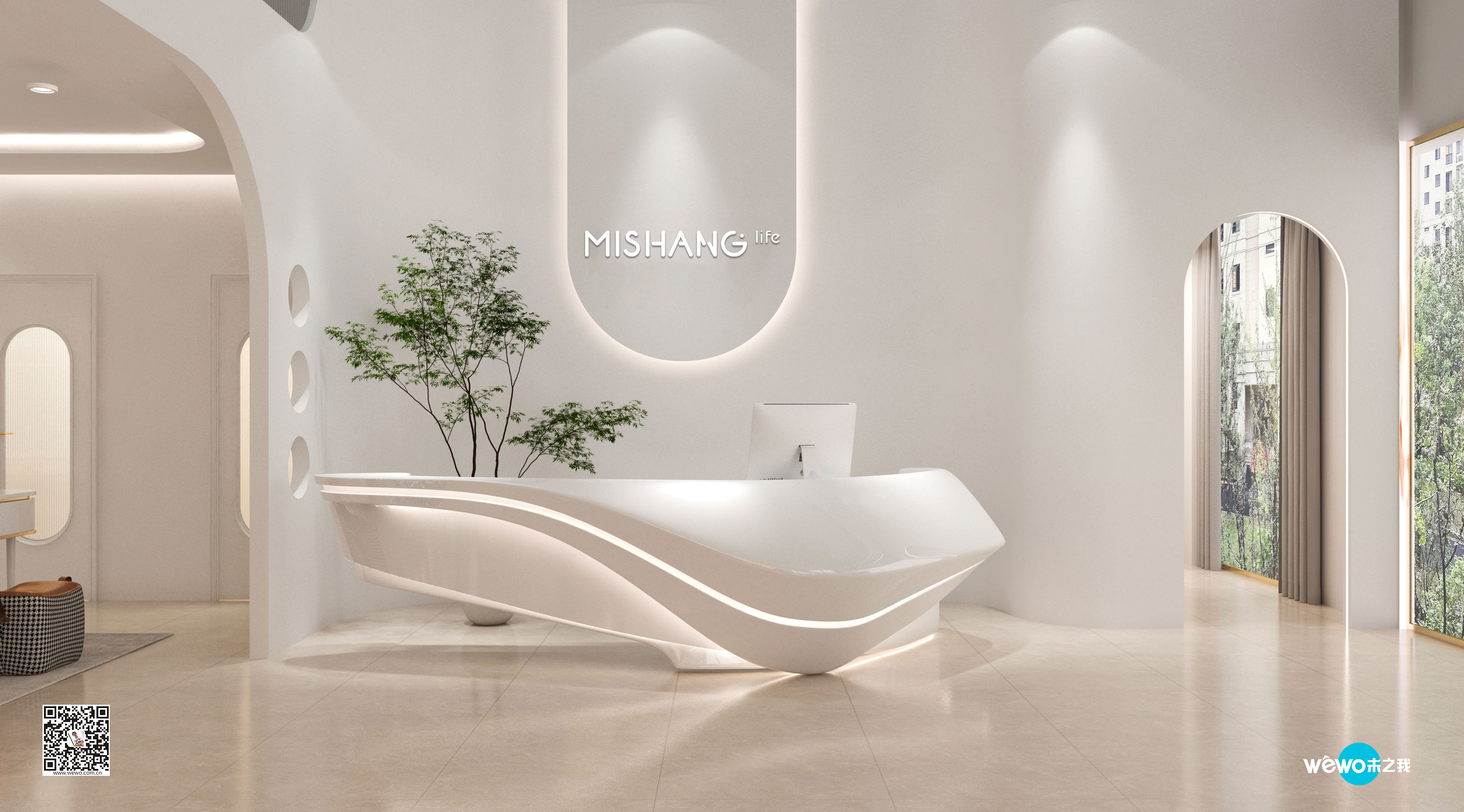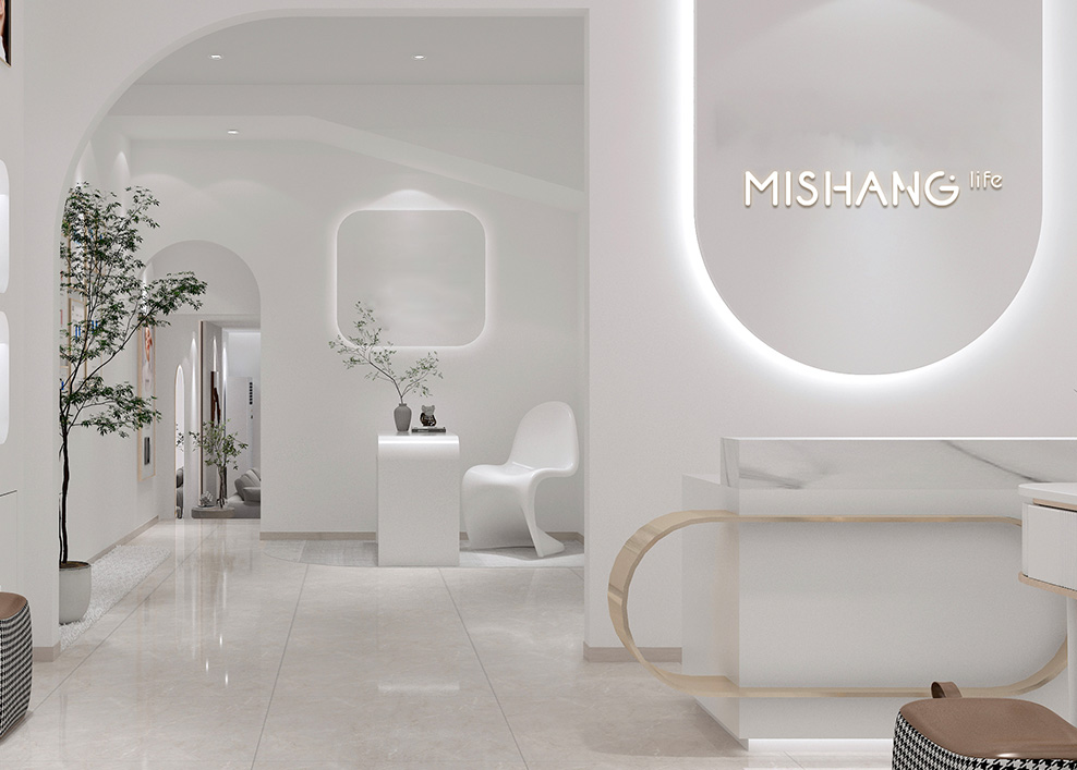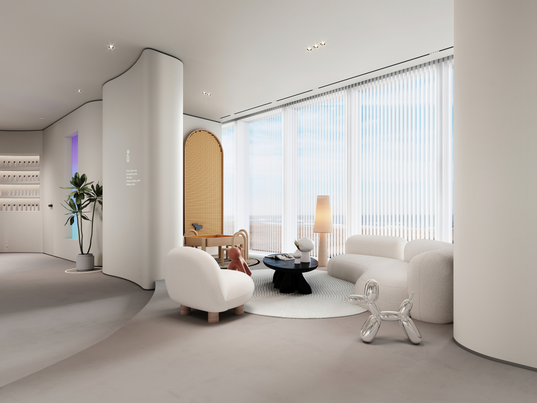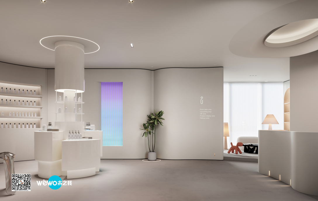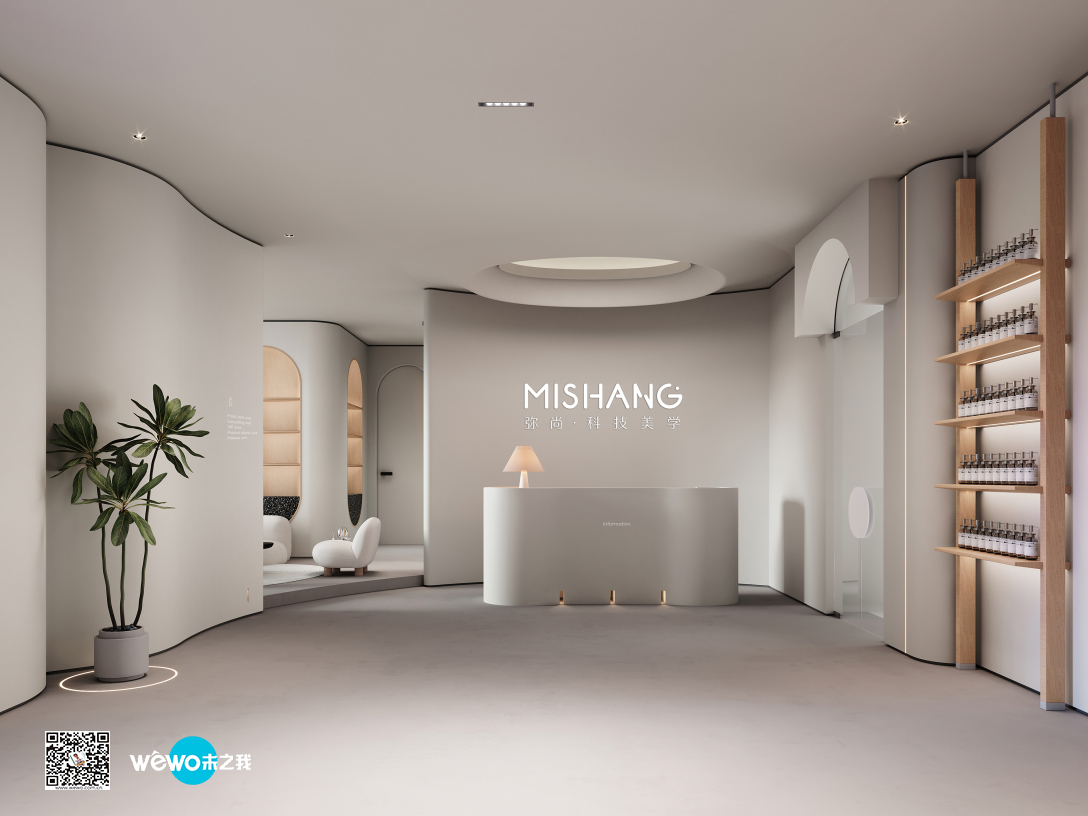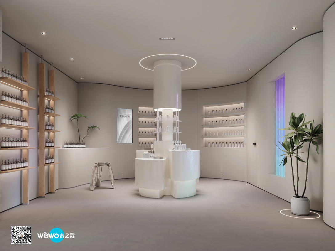 店铺设计希望传达专业、安全、时尚的感觉,曲线与光感的渐晕结合,仿佛预知着新生的蜕变。整体空间采用柔和的中性色调,来突出各类材质的特性,感受丰富的空间层次。干净的线条和温暖的机理,无不展现着简约美学。