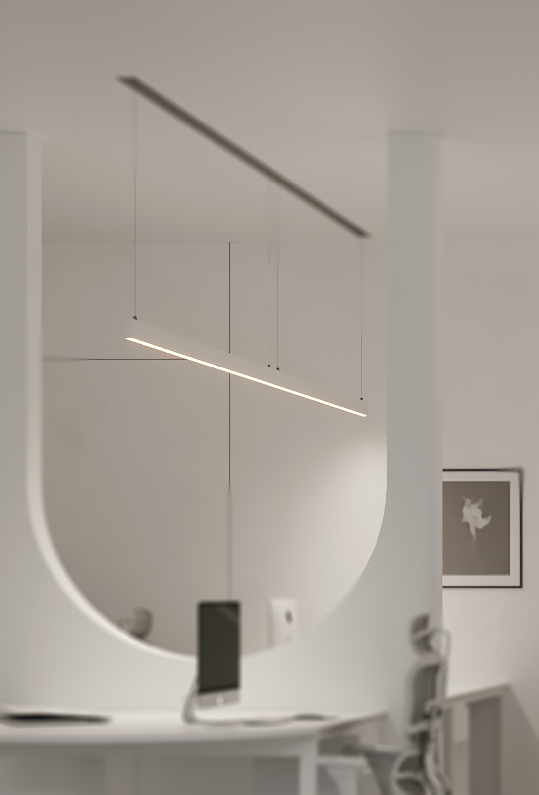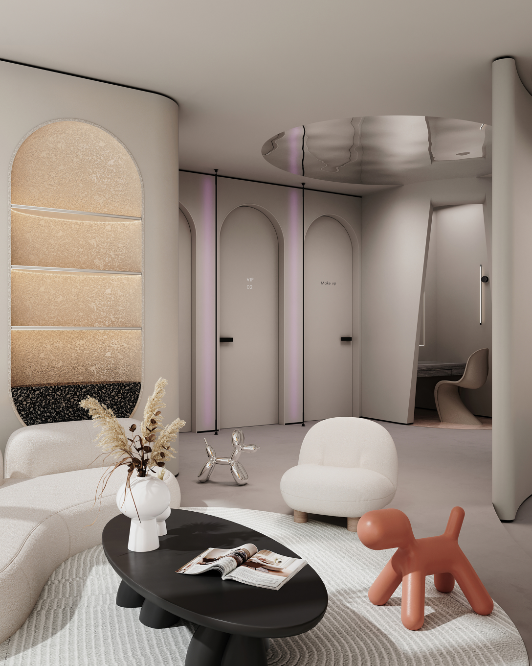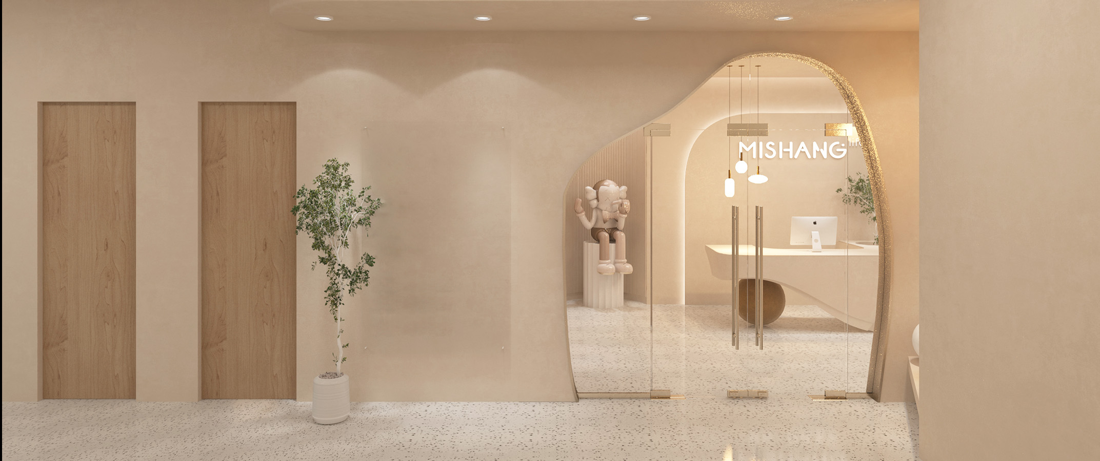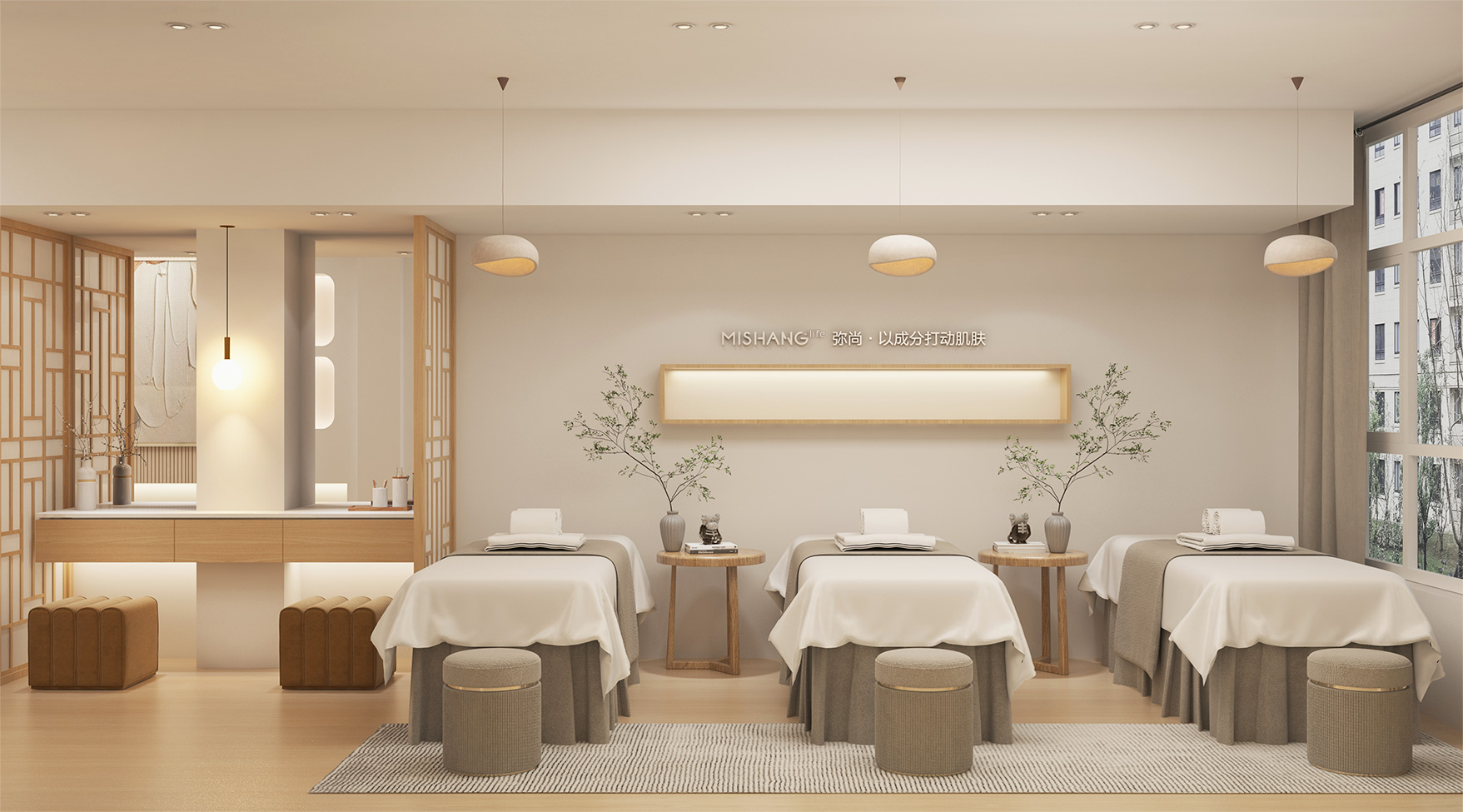 店铺设计希望传达专业、安全、时尚的感觉,曲线与光感的渐晕结合,仿佛预知着新生的蜕变。整体空间采用柔和的中性色调,来突出各类材质的特性,感受丰富的空间层次。干净的线条和温暖的机理,无不展现着简约美学。