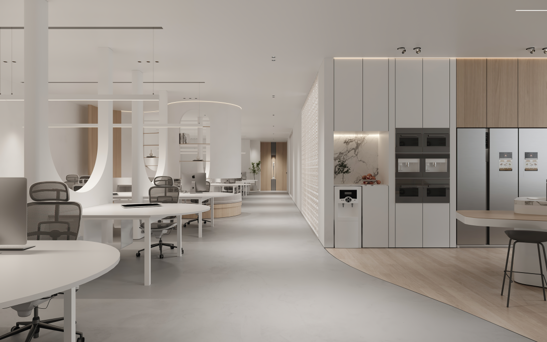 行政部、电商部的过道尽头是休闲茶水区,采用内嵌式橱柜设计,让空间更具一体性。同时利用圆弧曲线和层次变化的设计,打造自由的半开放式公共活动区。策划部延续简约舒适的设计灵感,拱形和建筑元素被重新创造,艺术化的构建让办公也充满了惊喜感。