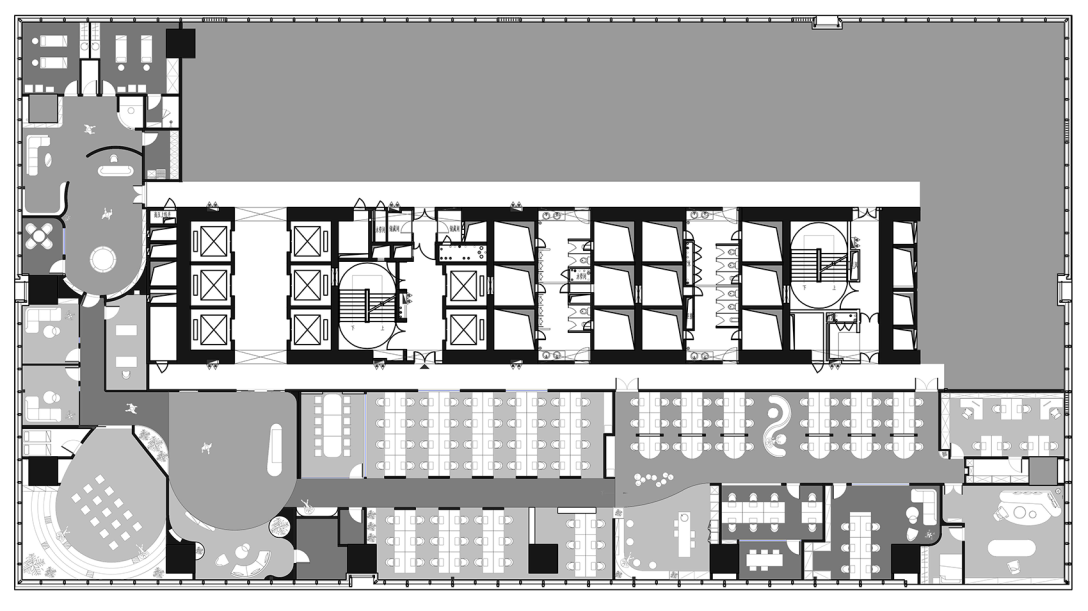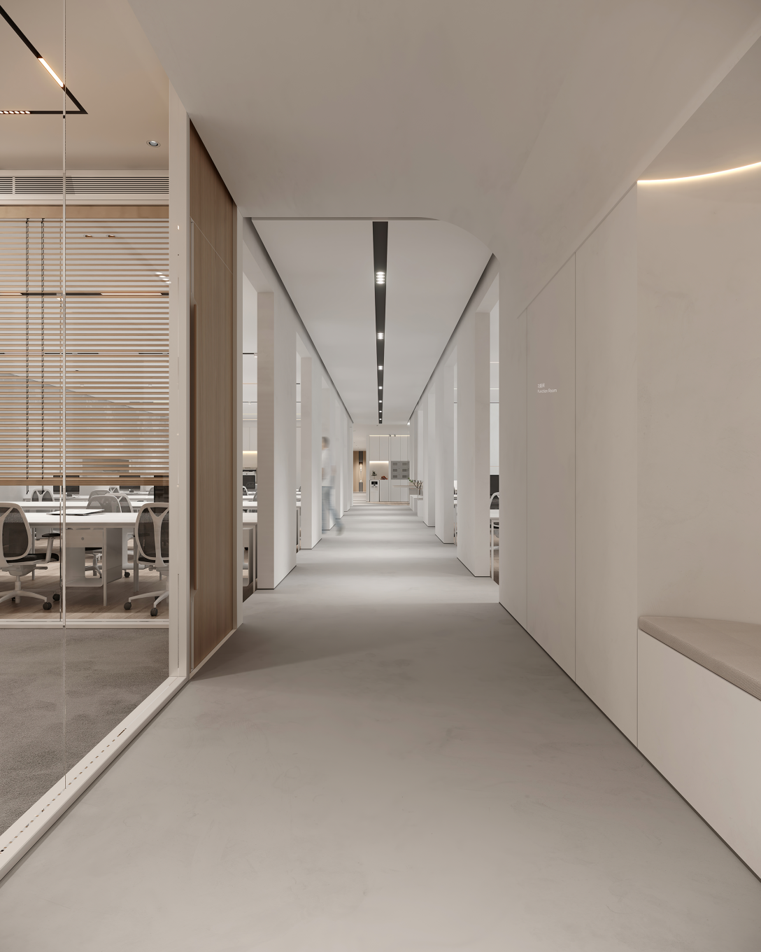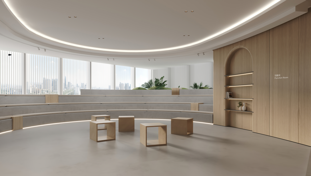 阶梯会议室是颇具艺术感的空间,以简单的灰度营造优雅质感,利用大面积玻璃引入光线,让光与影在这里书写时间的流逝,静谧而沉稳。半弧形踏步造型与顶面相呼应,给人包容一切的力量,适合来一场思想上的碰撞。一侧墙面还设计了书架供员工阅读拓展,知识的力量,就如空间给人的感觉,安静而有力。小会议则保持着严谨规矩的风格,用木质调节点缀,减弱会议室的严肃感。