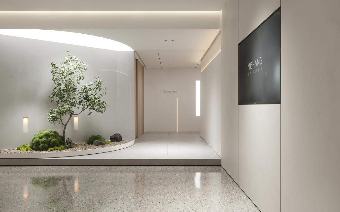 前台区域通过曲直有序的设计建立了入口的形态结构,搭配圆弧灯环,使得空间充满了灵动感。看似没有过多造型,却暗藏心机,利用质感材质打造一个简约又不失格调的空间。入口的植物造景柔和了空间冷肃之感,以清新的自然气息成为了吸睛一笔。