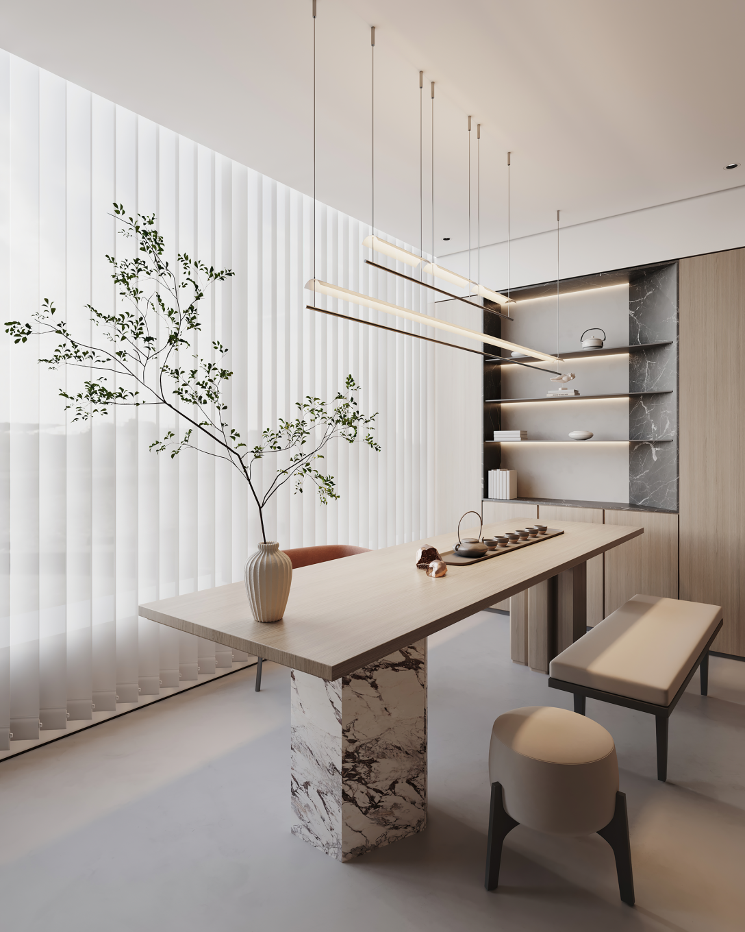 空间本身的材质语言非常简单,以微水泥和艺术漆作为主基调,细腻柔和的质感,并带有沉稳的一面,为空间带来优雅艺术的气息。在此基础上加入天然石材、木质以及绿植点缀,呈现舒适生活化的工作环境。