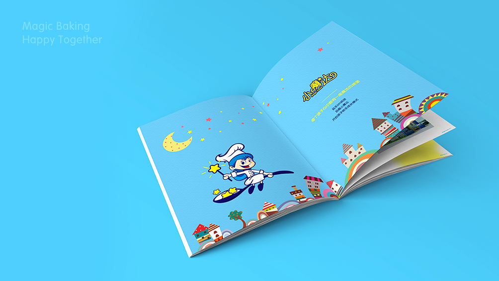 因此,我们分析并锁定小魔达的品牌策略核心:“玩趣”和“魔法”,将“趣味性、想象力、创造性” 作为品牌个性,并且,向小朋友们讲诉了一个烘焙嘉年华的童话故事。